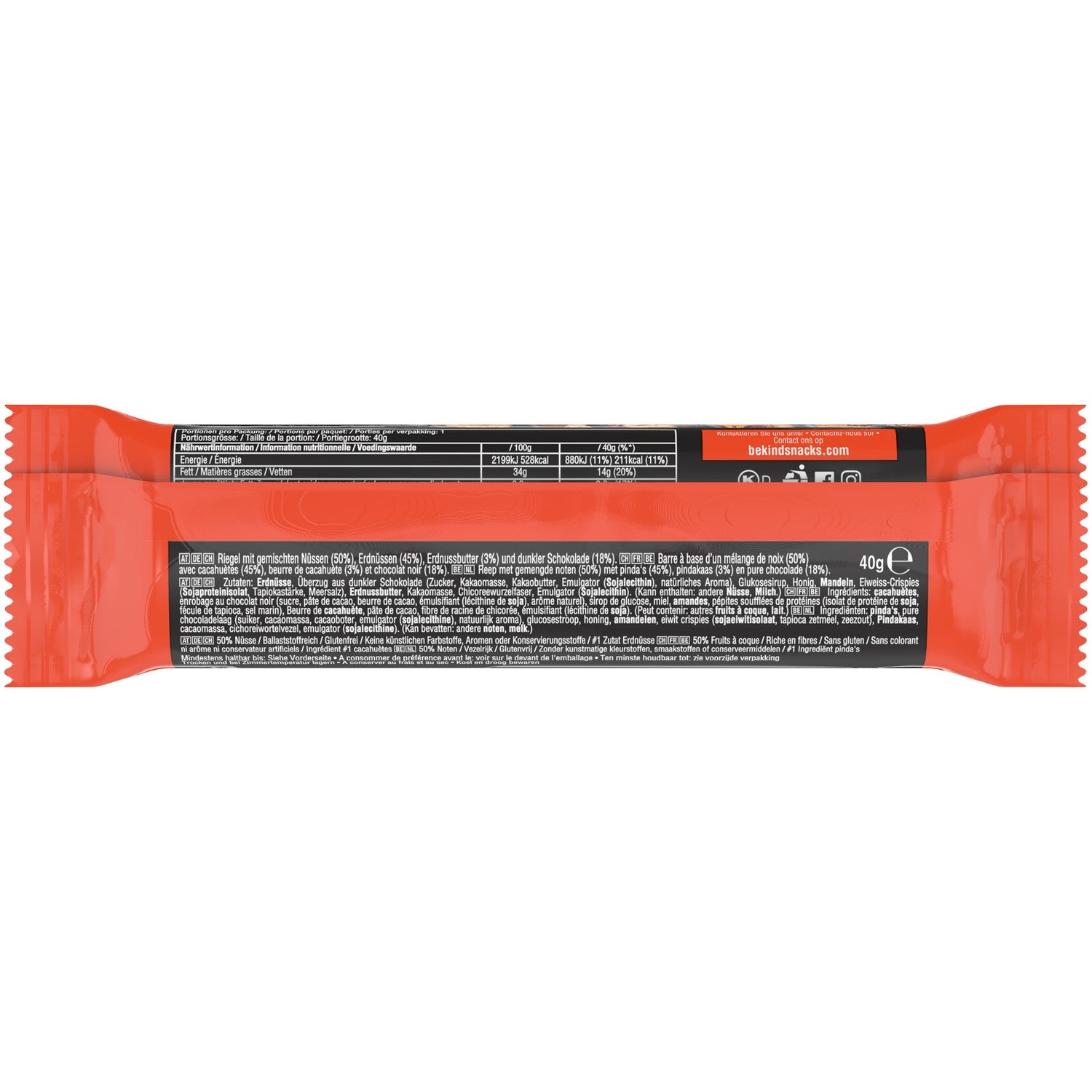 Ingredients: PEANUTS, dark chocolate coating (sugar, cocoa mass, cocoa butter, emulsifier (SOY lecithin), natural flavoring), glucose syrup, honey, ALMONDS, protein puffs (SOY protein isolate, tapioca starch, sea salt), PEANUT butter, cocoa mass, chicory root fiber, emulsifier (SOY lecithin). (May contain: other NUTS, MILK).