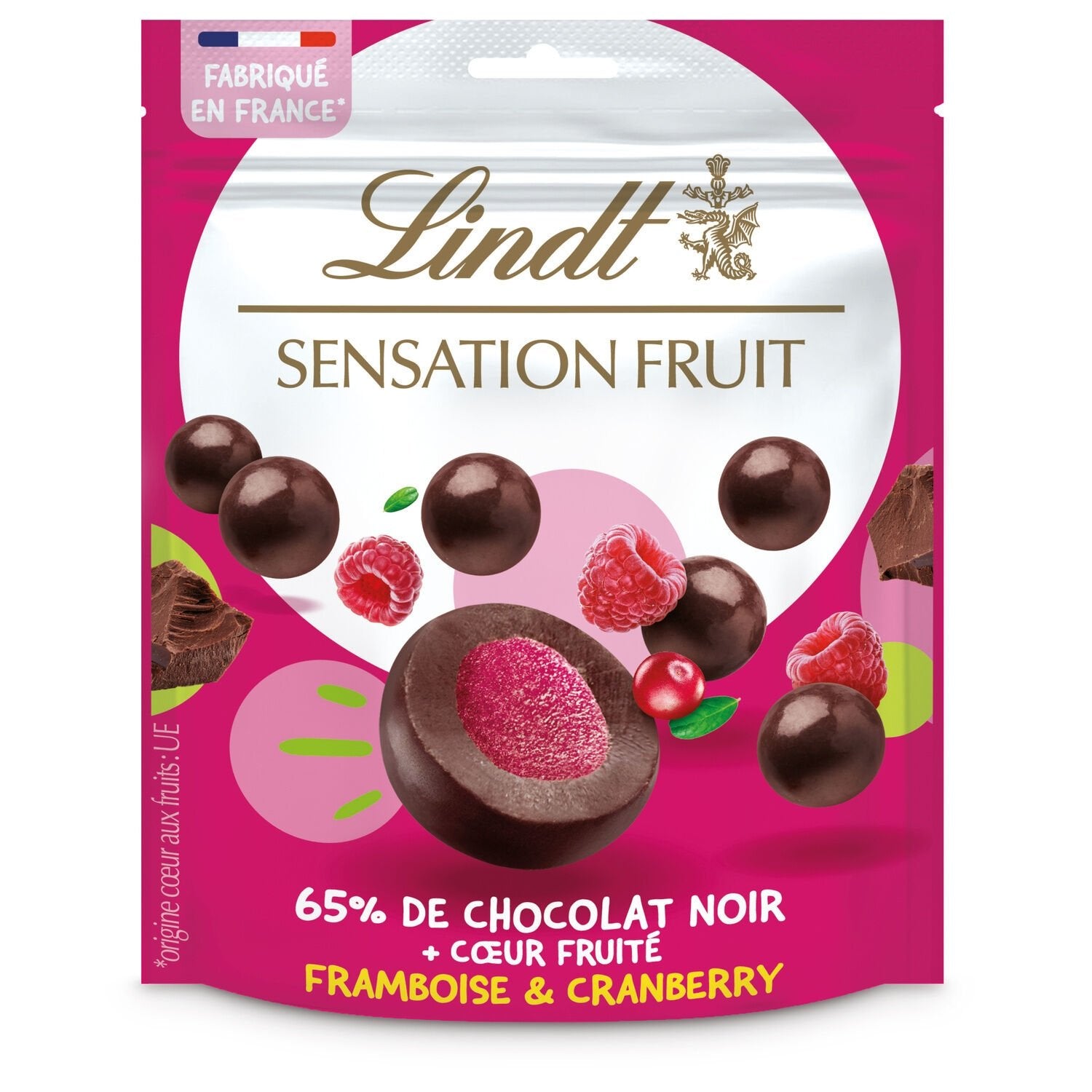 Lindt Sensation Fruit dark chocolate balls have a soft, fruity center, where the subtlety of raspberry meets the exoticism of cranberry.,Savor the delicious combination of fruit and chocolate with the Lindt Sensation Fruit range.,Made from the finest ingredients and sustainably sourced cocoa beans.,Since 1845, Lindt has delighted the taste buds of chocolate lovers with its quality products.,For the Lindt Sensation Fruit range, the Maîtres Chocolatiers have created gourmet recipes coated in the finest chocolate.