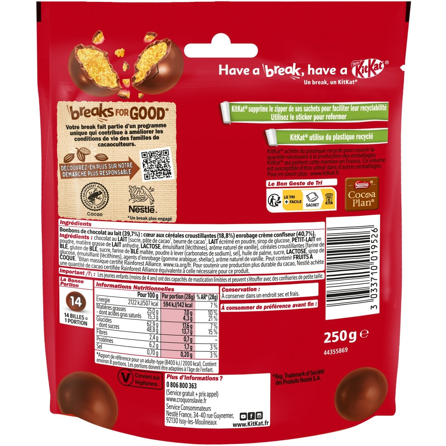 Ingredients: MILK chocolate, sugar, cocoa mass¹, cocoa butter¹, skimmed MILK powder, glucose syrup, WHEY powder, anhydrous MILK fat, LACTOSE, emulsifier (lecithins), natural vanilla flavoring, crispy cereals: WHEAT flour, WHEAT GLUTEN, sugar, malted WHEAT flour, raising agent (sodium carbonates), salt, palm oil, sugar, LACTOSE, glucose syrup, emulsifier (lecithins), glazing agents (gum arabic, shellac), natural vanilla flavoring. May contain NUTS. ¹Rainforest Alliance certified mass balance. www.ra.org/fr. To support more sustainable cocoa production, Nestlé purchases an equivalent quantity of Rainforest Alliance certified cocoa to that needed for this product.