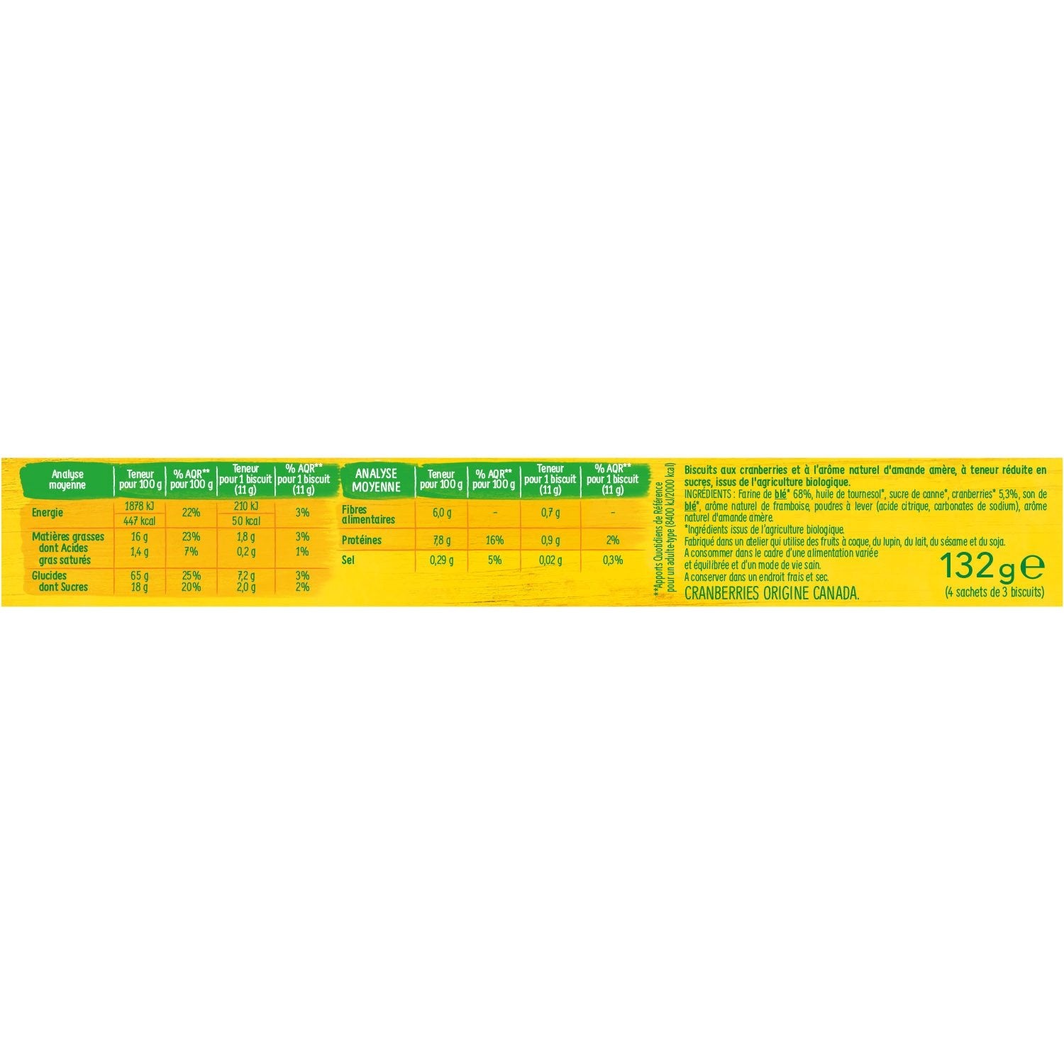 Enjoy a tasty break by enjoying the sweetness of almonds enhanced by the tangy and sweet taste of cranberries in this delicious and crunchy organic cookie! This organic recipe contains little sugar, saturated fat, and salt, in line with our values. Our organic cookies are made in France and our wheat flour comes from a 100% French organic sector.