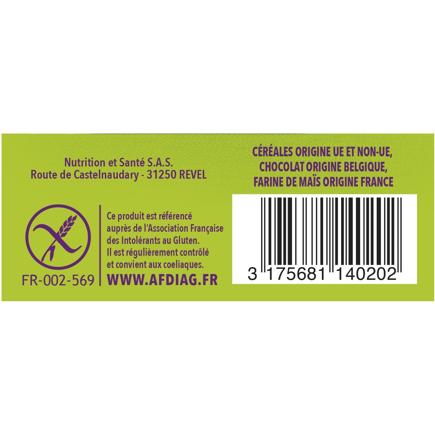 Breakfast biscuit made from rice and corn flour, with chocolate chips, gluten-free and lactose-free, suitable for people intolerant to gluten and/or lactose.