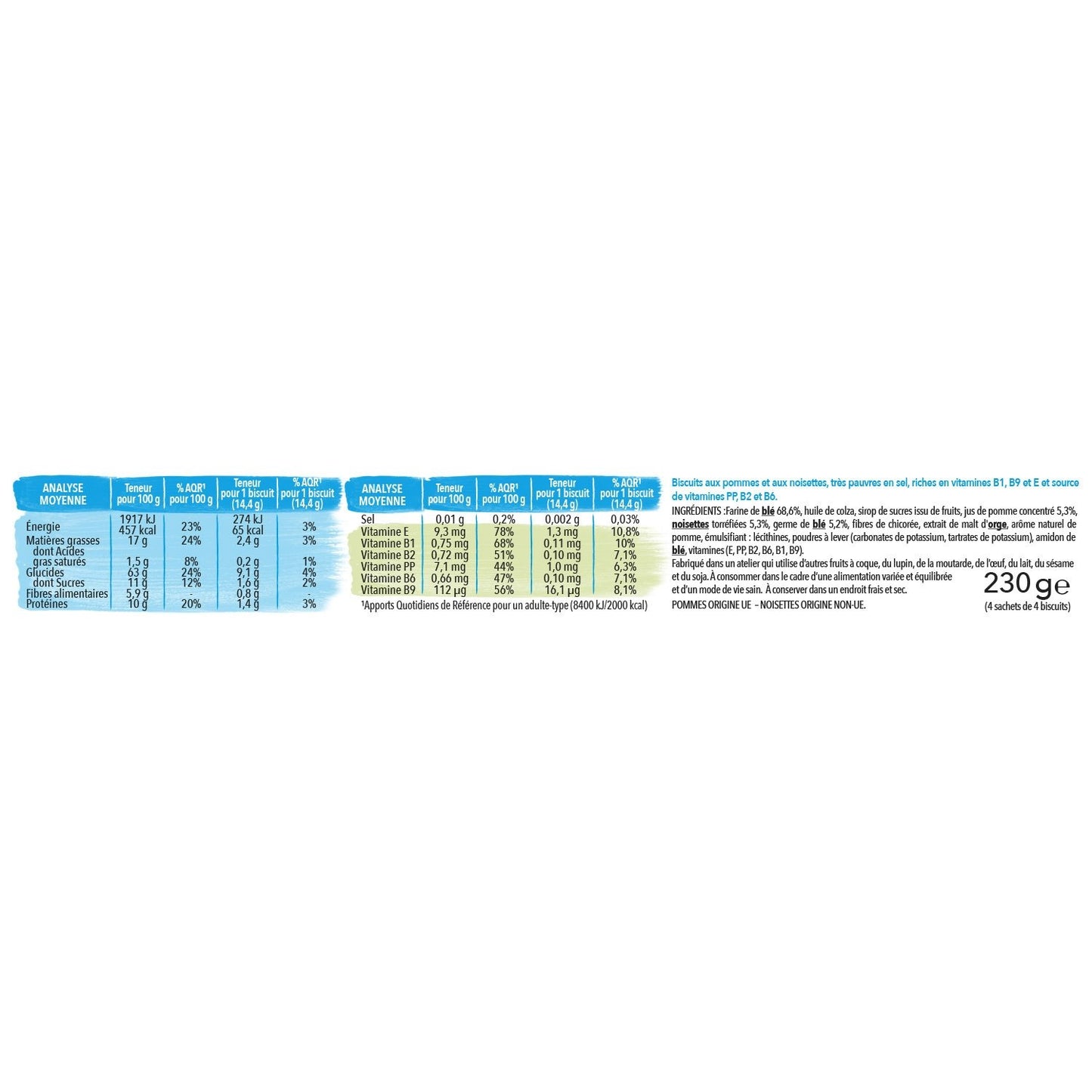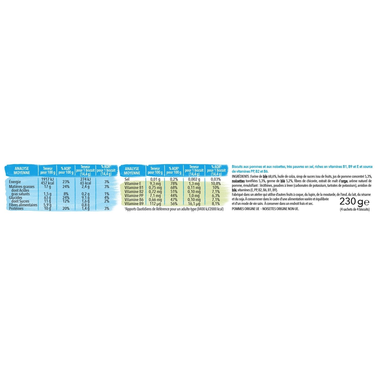 Apple and hazelnut biscuits, very low in salt, rich in vitamins B1, B9 and E and a source of vitamins PP, B2 and B6