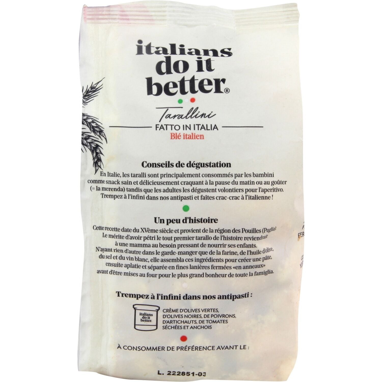 Soft WHEAT flour (origin: Italy), white wine (contains SULPHITES), olive oil, extra virgin olive oil, salt, fennel seeds 0.9% (origin: non-EU).