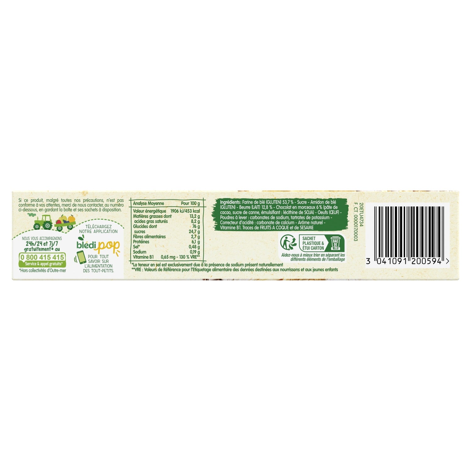 Ingredients: Wheat flour (GLUTEN) 53.5% - sugar - wheat starch (GLUTEN) - butter (MILK) 12.8% - chocolate pieces 6% (cocoa mass, sugar, emulsifier: SOY lecithin) - EGGS - raising agent: sodium carbonates, potassium tartrates - acidity regulator: calcium carbonate - natural flavoring - vitamin B1. Traces of NUTS and SESAME