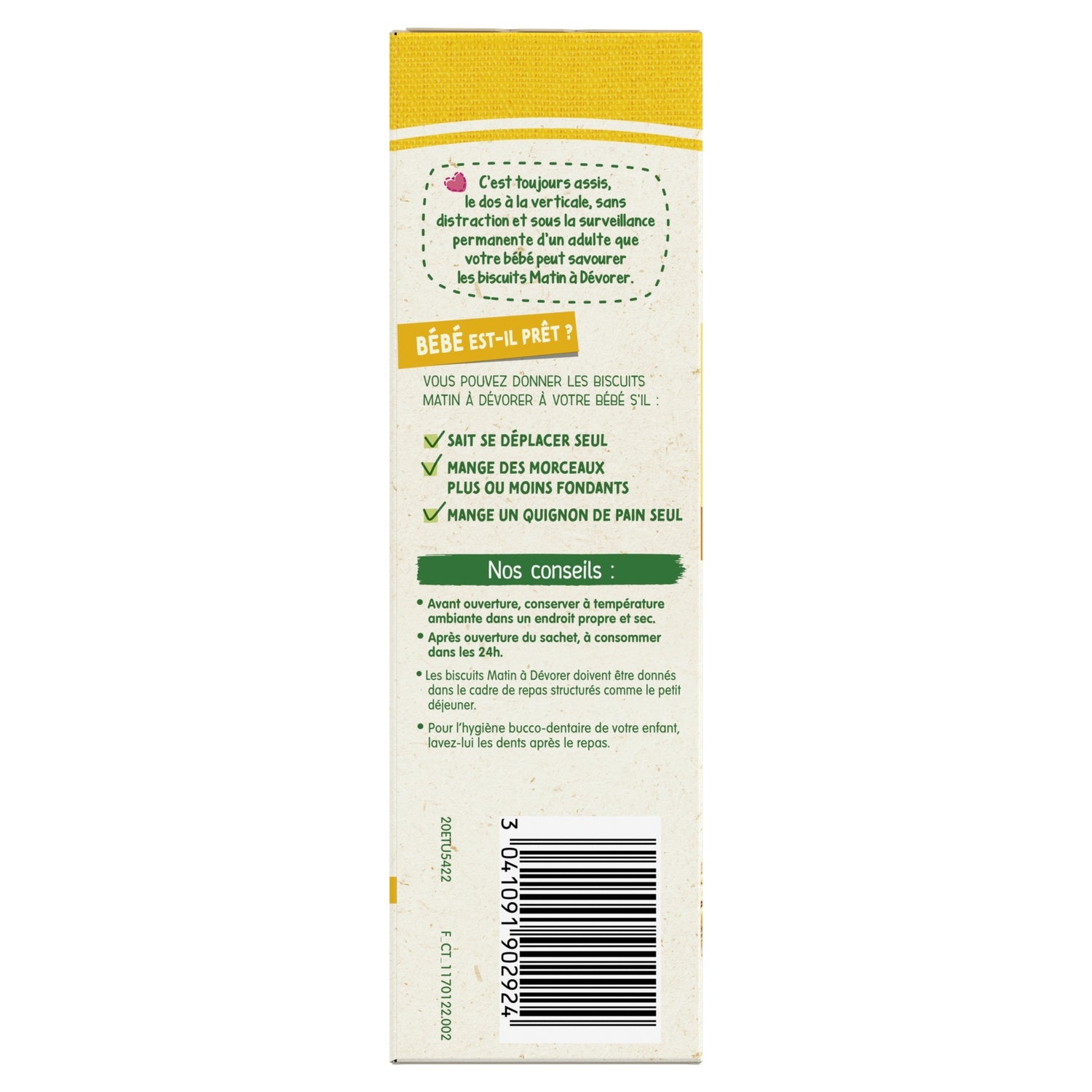Practical: a suitable breakfast consists of: 250 ml of your usual milk* + 2 Matin biscuits to devour or a slice of buttered bread + pieces of soft fruit *breast milk or infant formula.