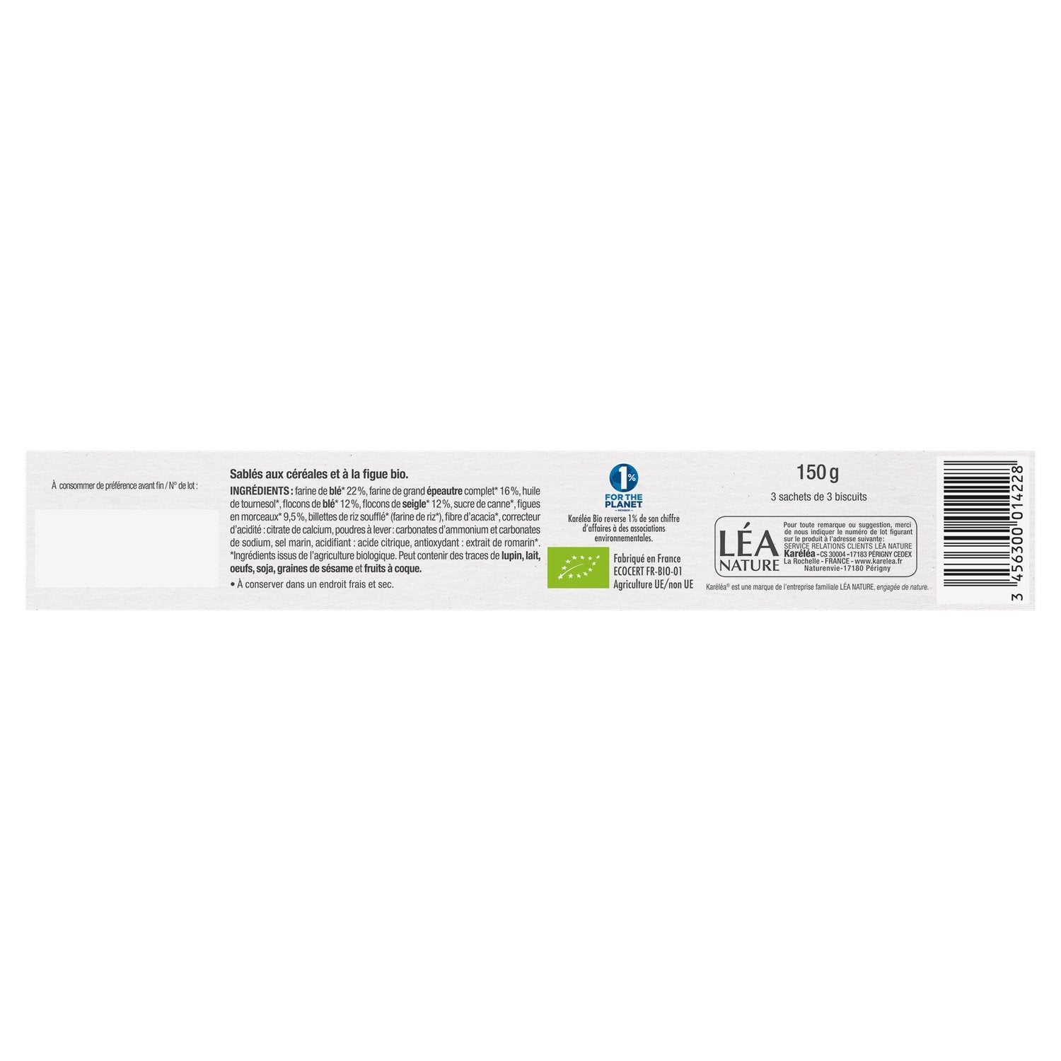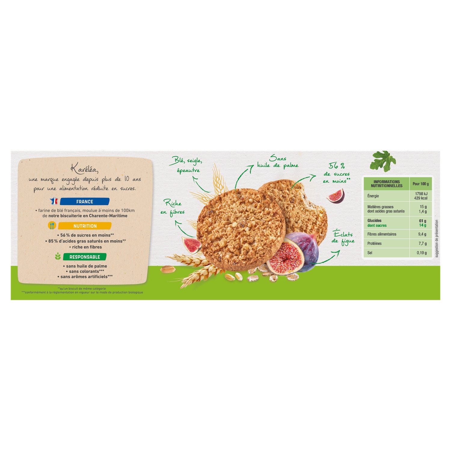 A combination of cereal flavors (wheat, rye, spelt) and fig in these delicious Karéléa Bio shortbreads, reduced in sugar, with no added flavors. Palm oil free Nutriscore B Made in Charente-Maritime in our biscuit factory French flour milled less than 100km from our biscuit factory Case + recyclable bag 1% For the planet Reduced in sugar: -56% less sugar vs the organic market No added flavors Rich in fiber 3 freshness bags of 3 biscuits