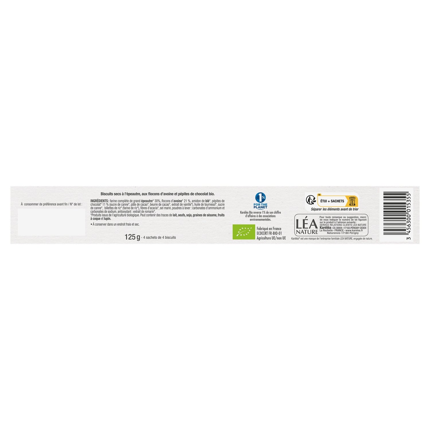 Palm oil free Spelt flour France Made in Charente Maritime in our biscuit factory Case + recyclable bag Case + recyclable bag 1% For the planet