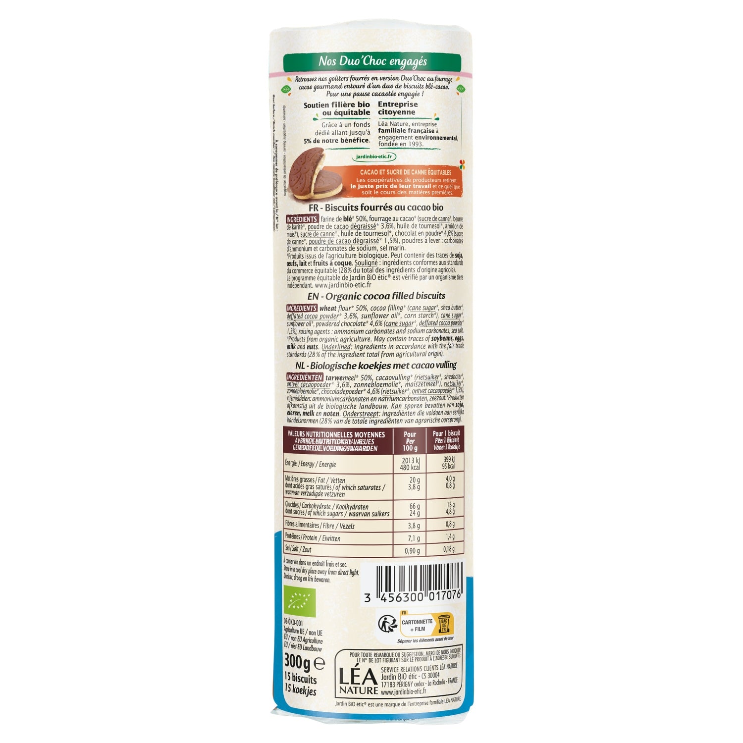Discover our filled snacks in the Duo Choc version: a delicious cocoa filling surrounded by a duo of biscuits: wheat flour and fair trade cocoa. For a responsible cocoa break! Fair trade sugar and cocoa Palm oil free 1% for the planet Recyclable packaging Organic Palm oil free 15 biscuits
