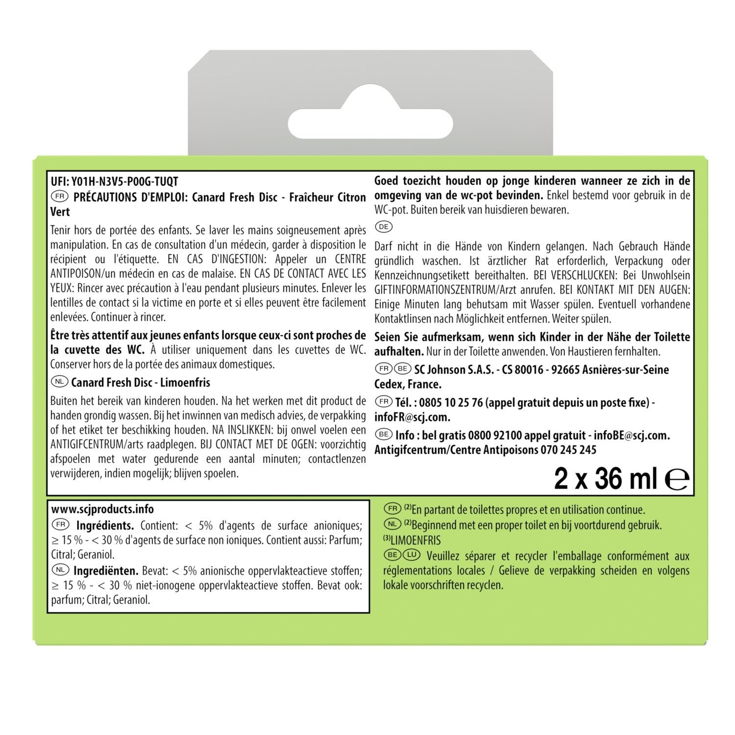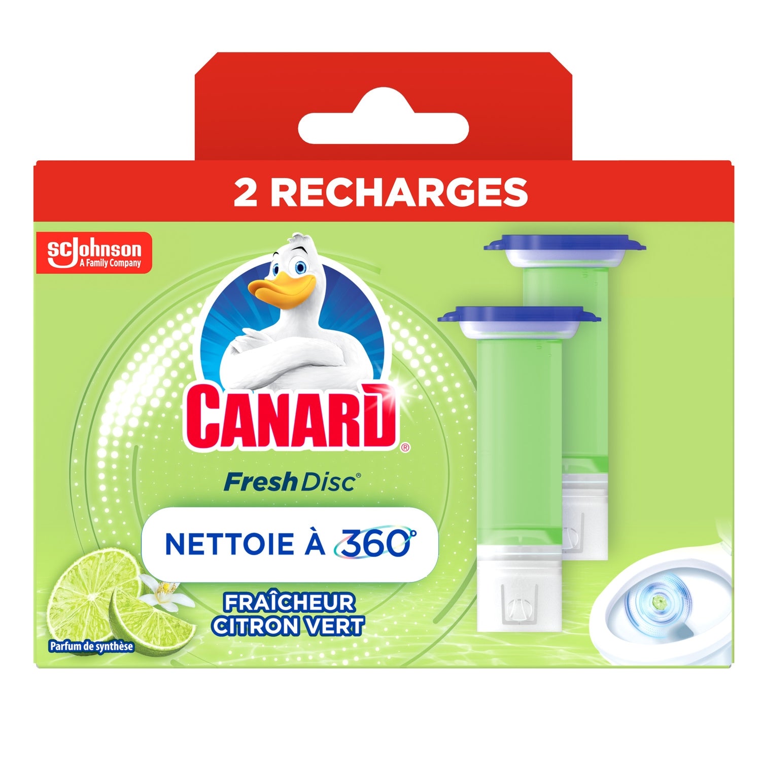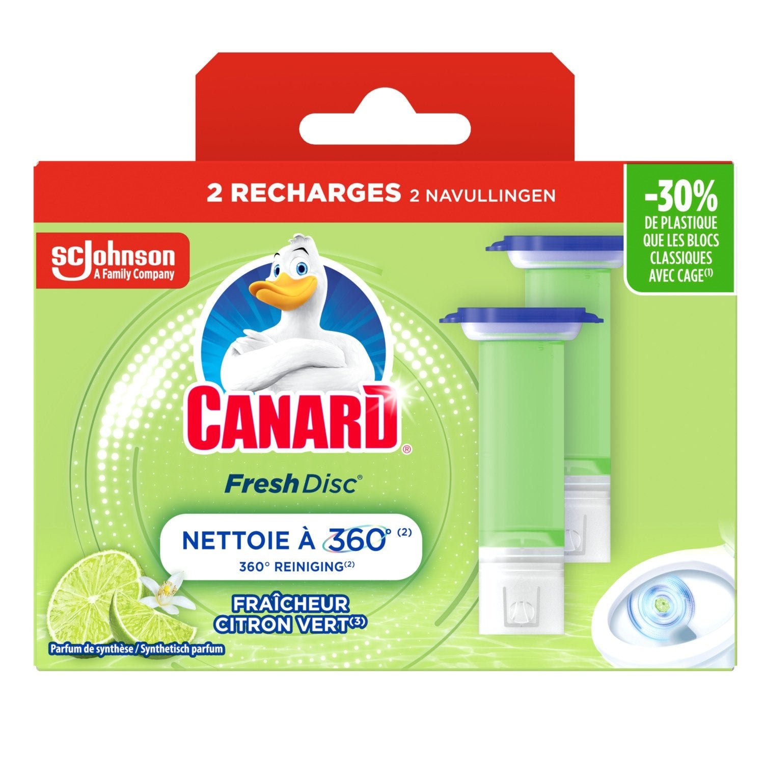 Fresh disc® - Discover Canard® Fresh Disc®, a cage-free block that fights limescale that can trap bacteria!,In refill format: an economical solution with less plastic*.,Cleans 360°**: Its unique technology allows 360° coverage of the walls of your toilet!,Fragrance: Diffuses a continuous Lime Freshness,Duration: A refill pack provides up to 16 weeks of effectiveness! Synthetic fragrance *vs. the purchase of 2 boxes. 1 double refill = -60% plastic vs. 2 boxes. **Starting with a clean toilet and in continuous use.