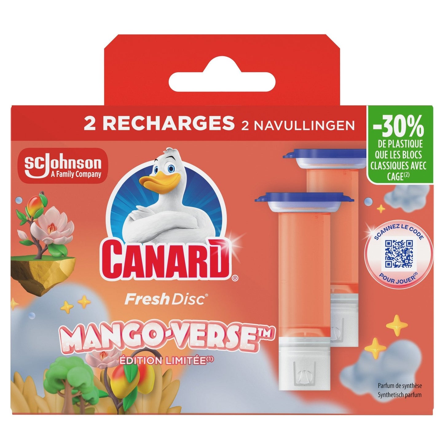 Turn bathroom breaks into a game! Scan the QR code on the packaging or play the world's freshest toilet games directly at: www.ducktoilettimearcade.com. Take your toilet cleaning routine to the next level: with the new Duck Toilet Fresh Disc® Mango-Verse™. With its 360° coverage, Duck Toilet Fresh Disc® ensures continuous freshness. No more contact with the bowl. Attach Fresh Disc® with the gel tube and you're done! Enjoy Mango-Verse™ freshness and fragrance with every flush. Fresh Disc® is suitable for septic tanks under normal use. For an incredibly clean toilet, combine Duck Toilet Fresh Disc® with Duck Toilet Intense Fresh Gel. Take your toilet cleaning routine to the next level! Fresh Disc® is the perfect teammate for 24/7 fragrance and 360° effectiveness. Easy application: Place the tube under the rim of the toilet bowl and press for instant freshness. Synthetic fragrance. Dangerous. Follow the precautions for use.