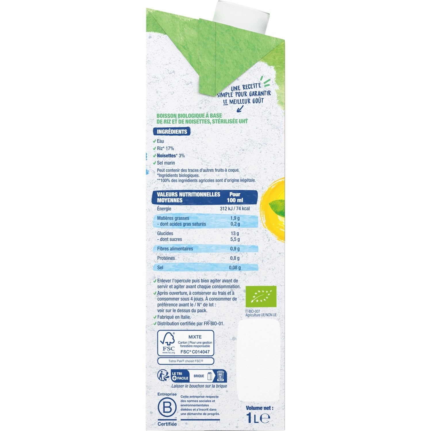 Organic drink made from rice and hazelnuts, UHT sterilized.