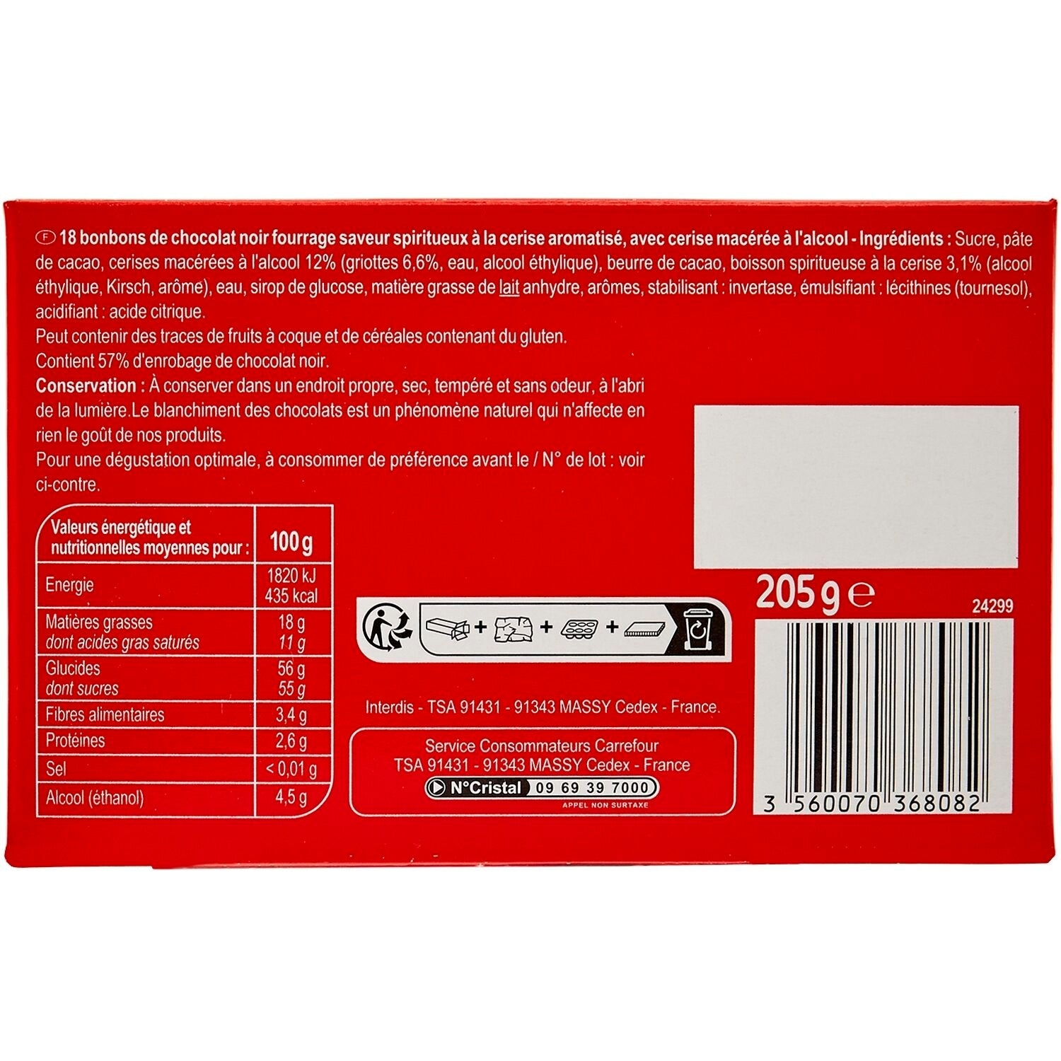 18 dark chocolate candies with cherry spirit flavor filling, with cherry macerated in alcohol