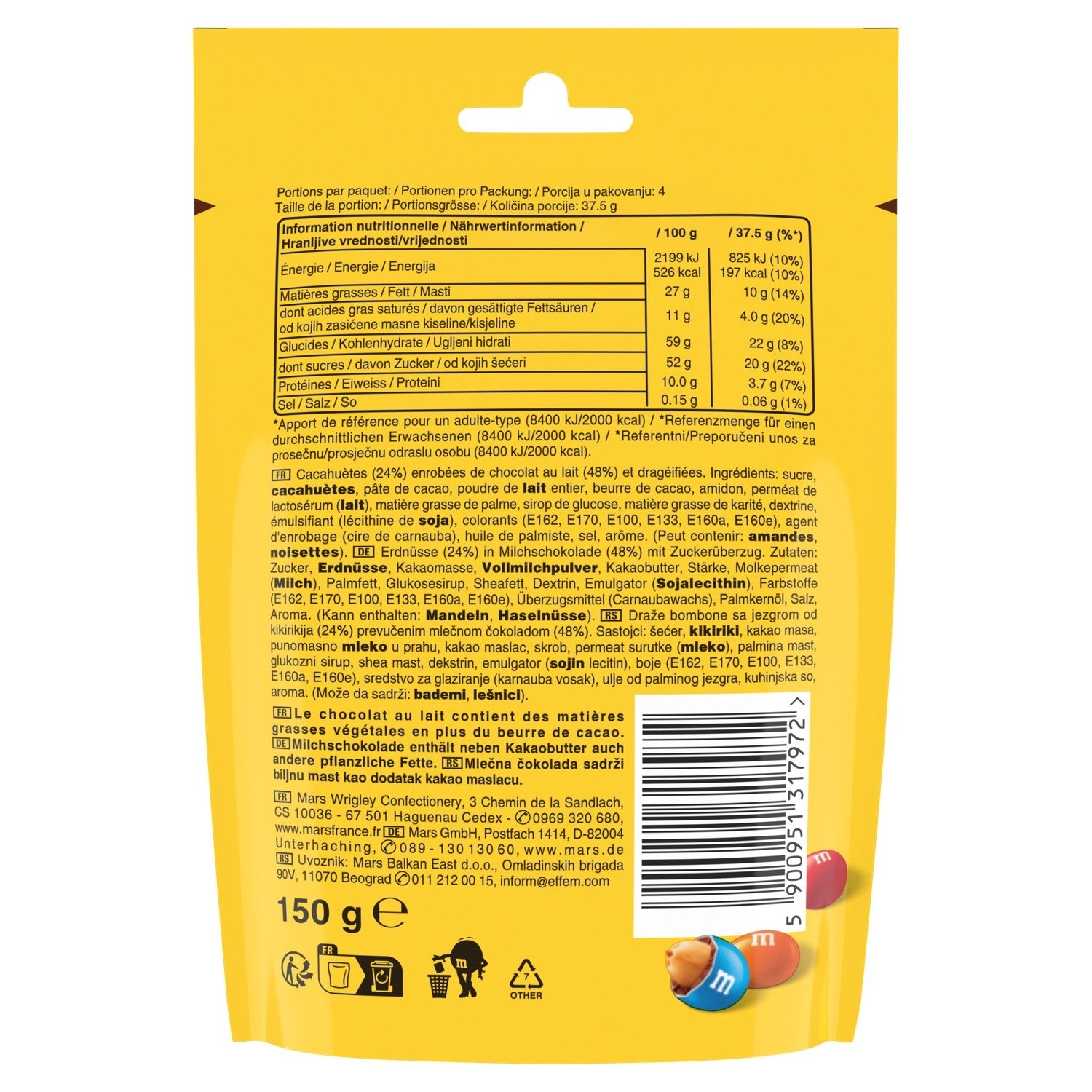 Ingredients: sugar, PEANUTS, cocoa mass, whole MILK powder, cocoa butter, starch, whey permeate (MILK), palm fat, glucose syrup, shea fat, dextrin, emulsifier (SOY lecithin), colors (E162, E100, E170, E133, E160a, E160e), glazing agent (carnauba wax), palm kernel oil, salt, flavoring. (May contain: ALMONDS, HAZELNUTS).