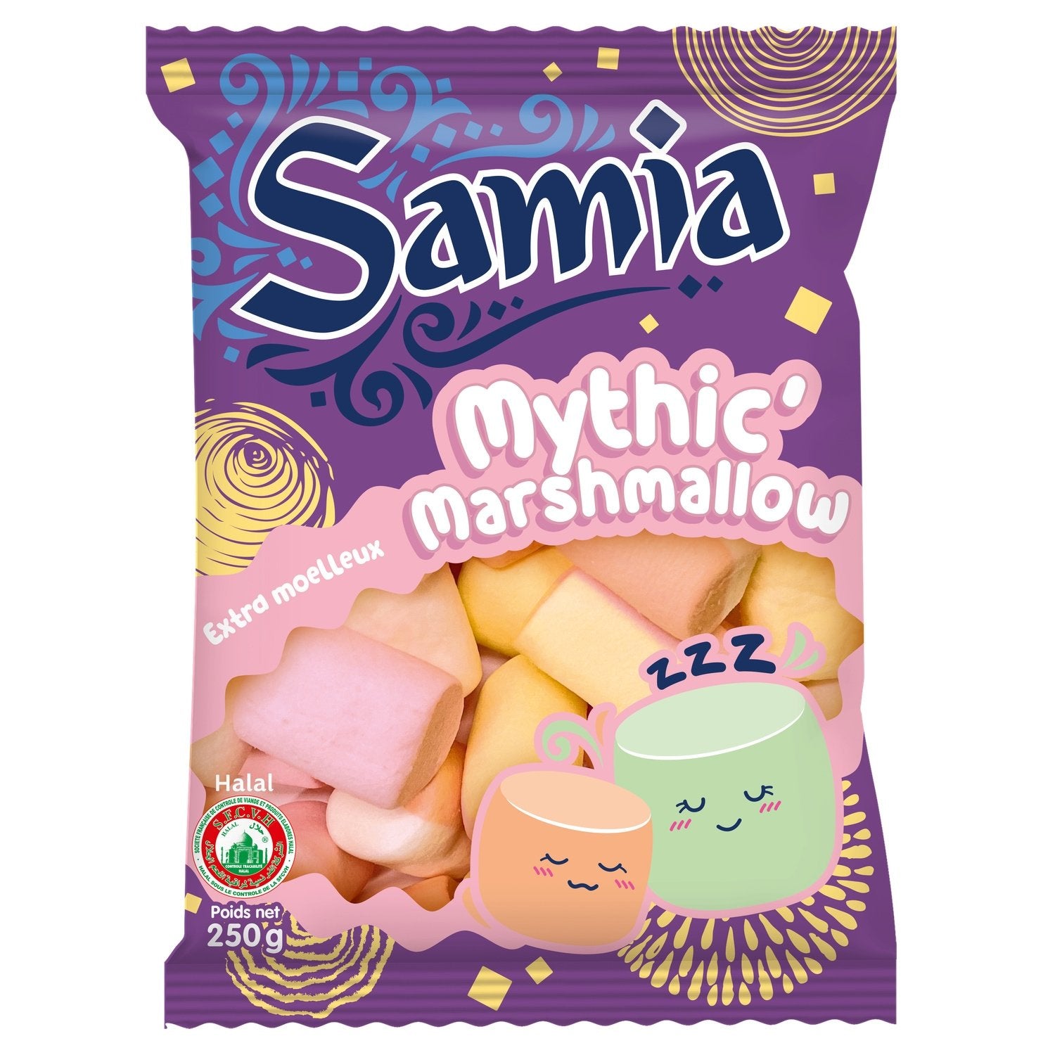 Soft marshmallows made with natural colors and certified HALAL by the SFCVH organization. Sold in bags.
