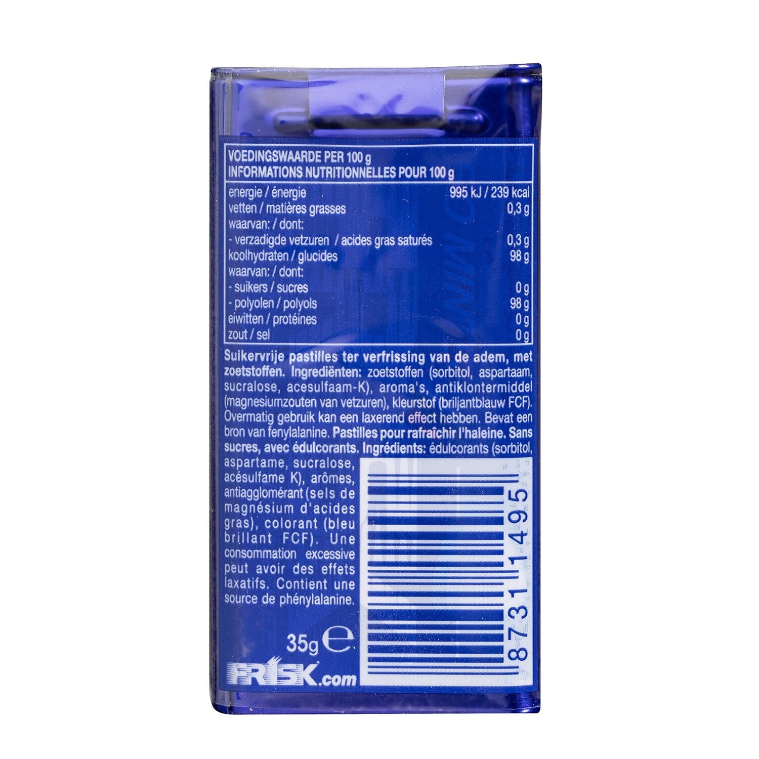 sweeteners (sorbitol, aspartame, sucralose, acesulfame-K), flavorings, anti-caking agent (magnesium salts of fatty acids), color (brilliant blue FCF)