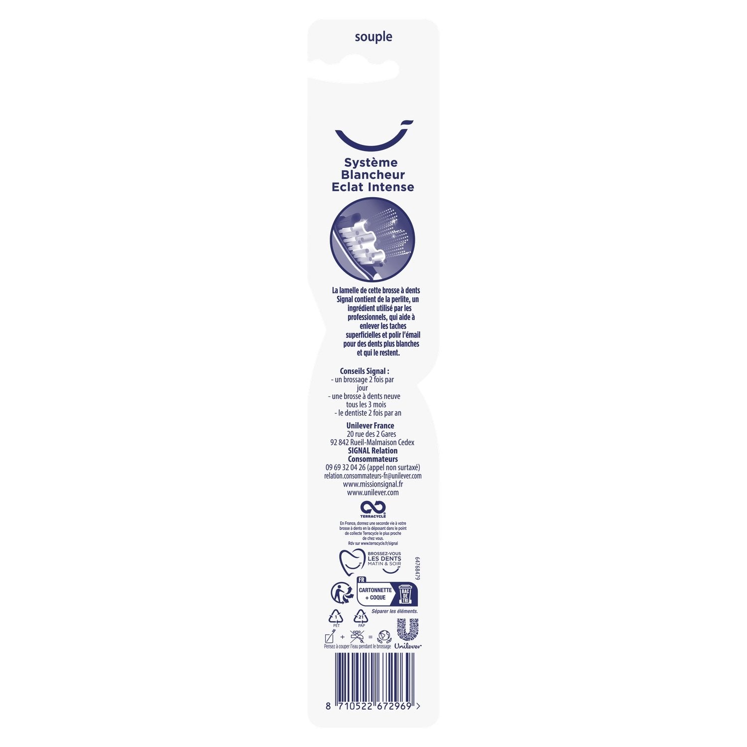 The Signal Intense Whitening System soft toothbrush is your whitening ally for a radiant smile,It helps remove surface stains and polish enamel for whiter teeth that stay white,The toothbrush blade contains perlite, a whitening ingredient used by dental professionals,The Signal Intense Whitening System soft toothbrush is also available in medium and hard versions, to meet all your needs,Deposit your Signal toothbrush at a TerraCycle® collection point for recycling,Our Signal advice: brush your teeth after every meal, change your Signal toothbrush every 2 to 3 months and visit your dentist at least twice a year