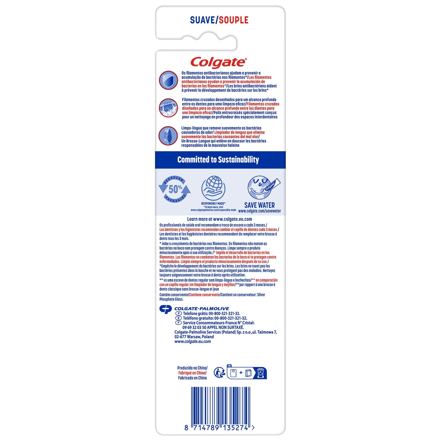 The Colgate ZigZag toothbrush features interlocking bristles that reach deep between teeth for a thorough clean. The toothbrush helps remove odor-causing bacteria with a tongue and cheek brush, and provides fresh breath.