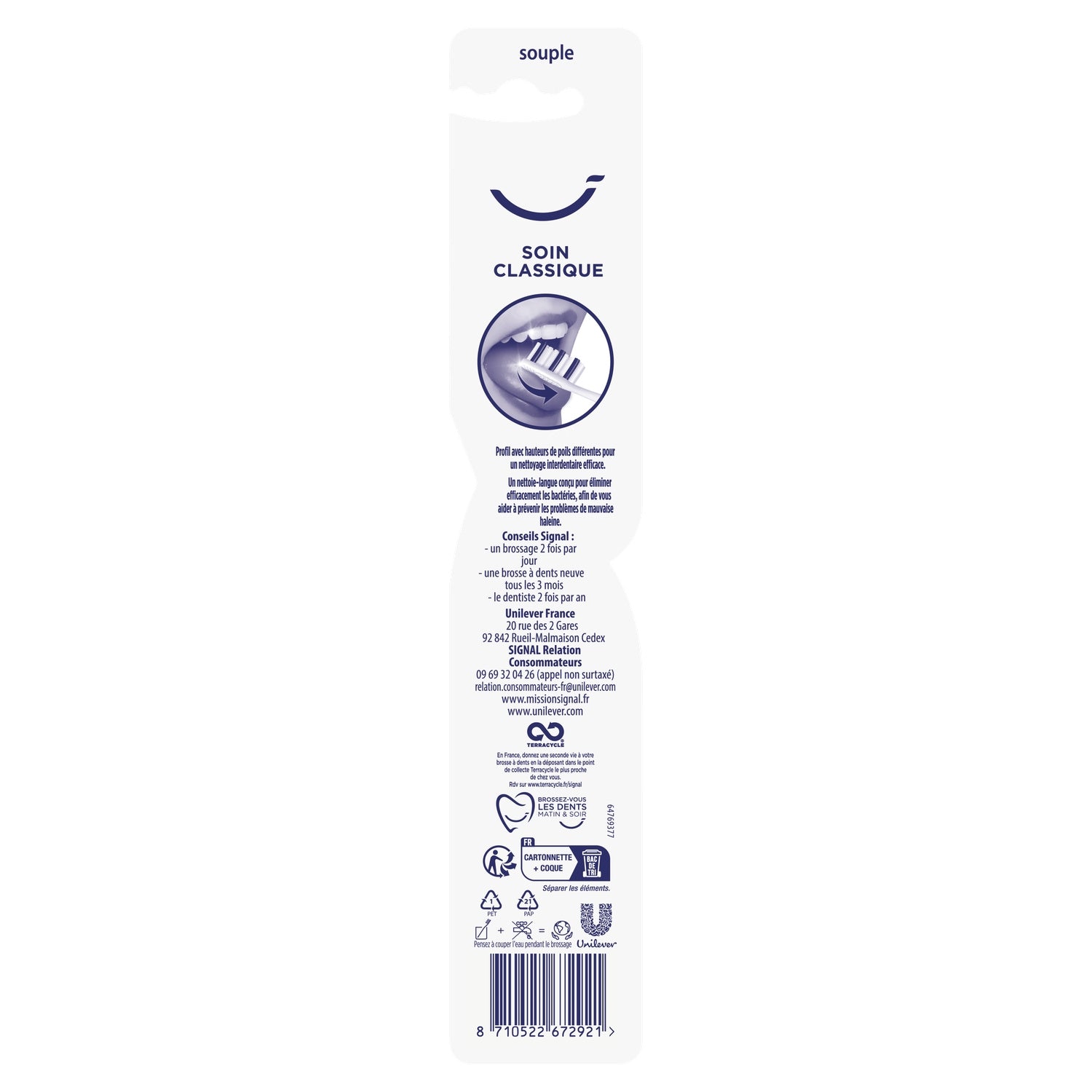 The Signal Care Classic soft toothbrush is your safe bet for good oral hygiene,Its profile is made up of different bristle heights which allows you to clean effectively between the teeth,This toothbrush has a tongue cleaner to effectively eliminate bacteria and prevent bad breath problems,The packaging of this toothbrush is made of 87% recycled plastic,Deposit your Signal toothbrush at a TerraCycle® collection point so that it can be recycled,Our Signal advice: brush your teeth after each meal, change your Signal toothbrush every 2 to 3 months and consult your dentist at least twice a year