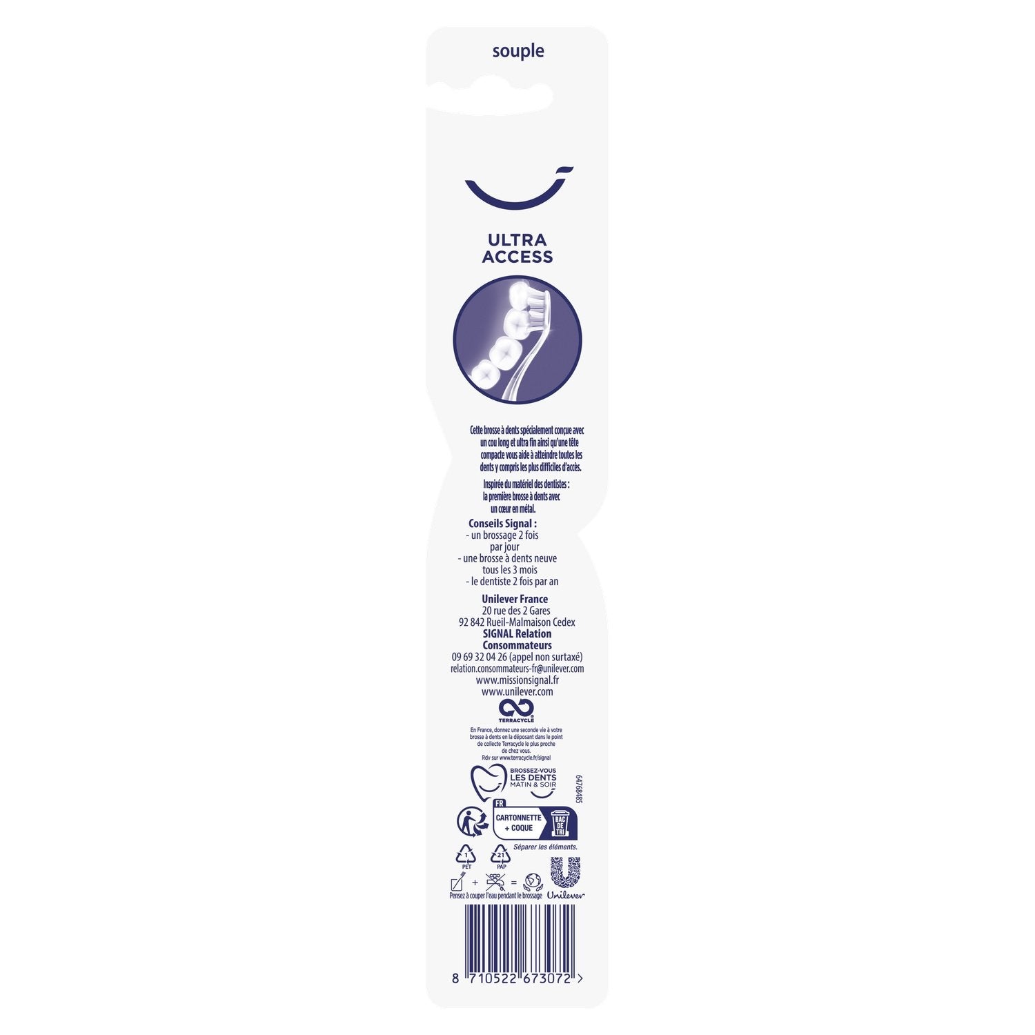The Signal Ultra Access soft toothbrush is your ally for impeccable teeth cleaning.,Its long, ultra-thin neck helps you reach all teeth, even those that are difficult to access.,The Signal Ultra Access toothbrush has a compact head for optimal cleaning, even in interdental spaces.,Inspired by dentists' equipment, it is the first toothbrush with a metal core.,Deposit your Signal toothbrush at a TerraCycle® collection point so it can be recycled.,Our Signal advice: brush your teeth after every meal, change your Signal toothbrush every 2 to 3 months and visit your dentist at least twice a year.