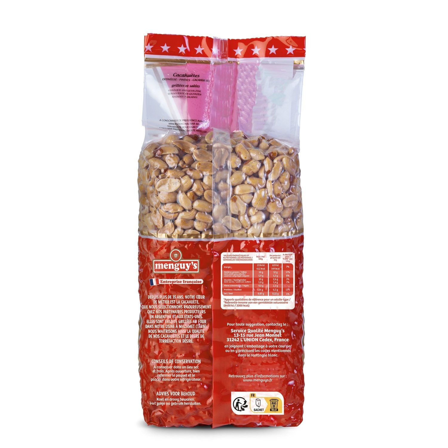 Carefully selected peanuts (Origin: Argentina or USA), thanks to a direct collaboration with our production partners for over 35 years. Oven-roasted with a drizzle of oil and a pinch of salt. Made in France (Mazamet, 81). No colorings or preservatives.