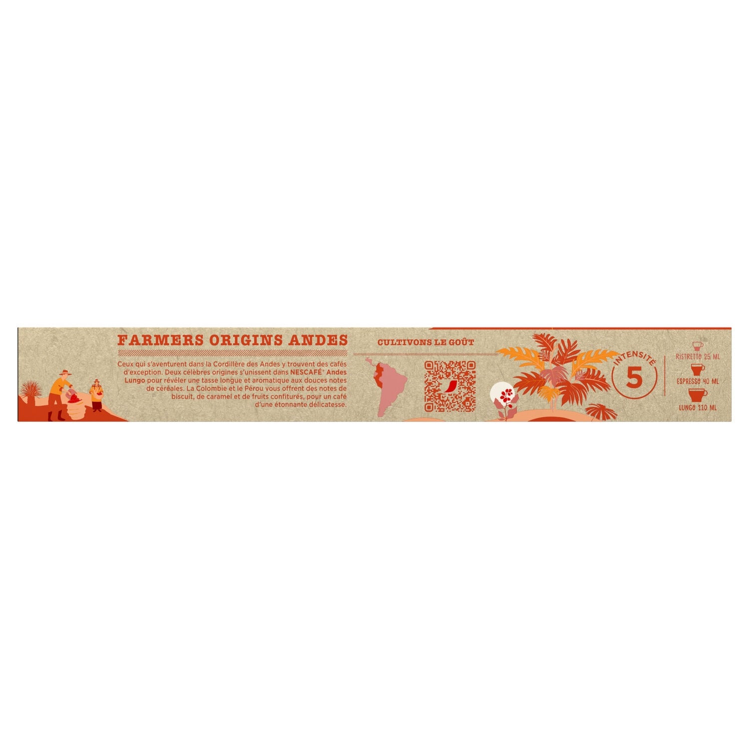 Discover NESCAFE® Lungo Andes, a blend of two famous origins offering a long, aromatic cup with sweet cereal notes. These Arabica beans, grown in Colombia and Peru, reveal notes of biscuit, caramel, and candied fruit, for a surprisingly delicate coffee. A box containing 10 capsules allows you to prepare 10 cups of NESCAFE® Lungo Andes with your NESPRESSO® machine. Intensity 5/12.