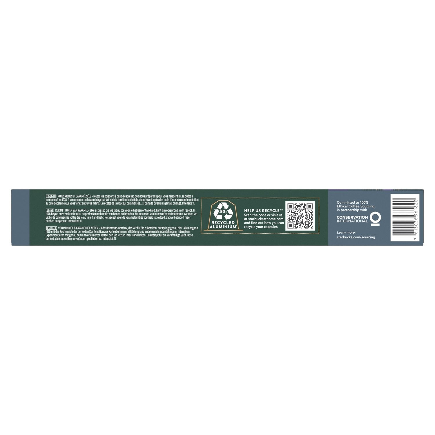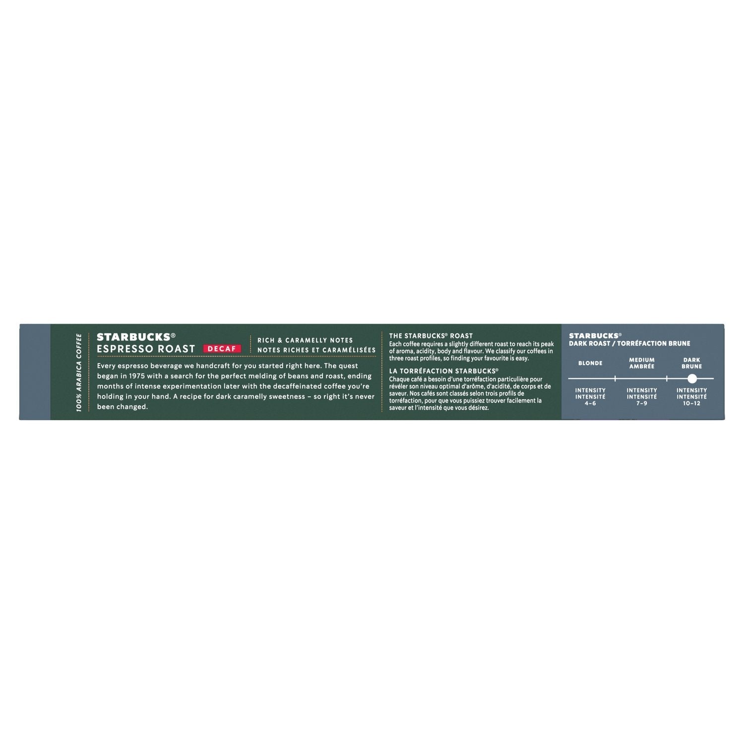 Discover STARBUCKS Espresso Roast Decaf capsules by NESPRESSO, a 100% pure Arabica coffee to prepare at home with your NESPRESSO machine. A dark roast that produces a rich and intense cup with caramelized notes. A box containing 10 capsules allows you to prepare 10 cups of STARBUCKS Espresso Roast Decaf coffee. Intensity 11.