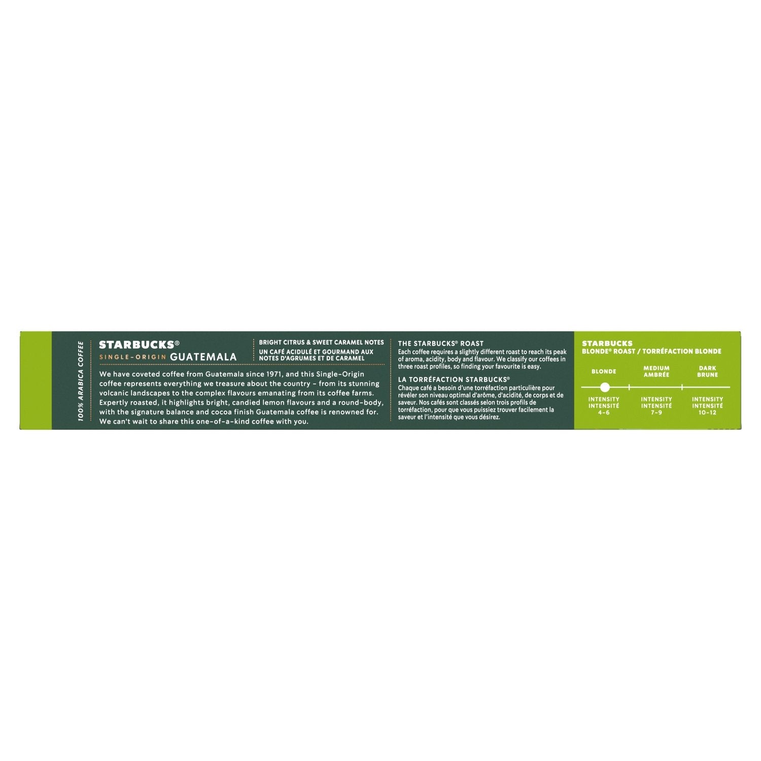 Discover STARBUCKS Single-Origin Guatemala capsules by NESPRESSO, a 100% pure Arabica coffee from Guatemala to prepare at home with your NESPRESSO machine. Enjoy a Latin American coffee with fruity notes and a round body. The box format containing 10 capsules allows you to prepare 10 cups of STARBUCKS Guatemala coffee. Intensity 5.