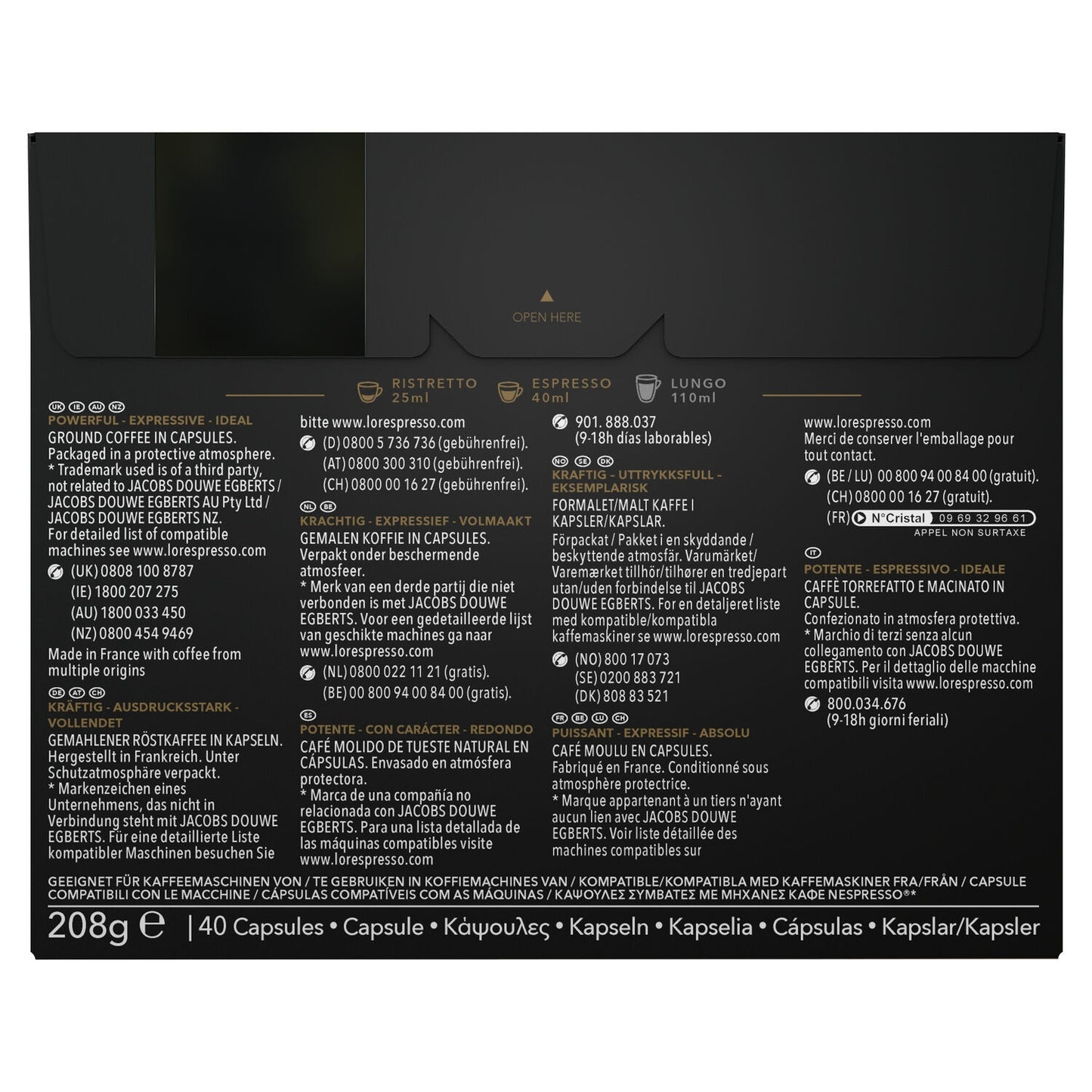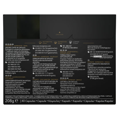 L'OR RISTRETTO coffee capsules dazzle the senses. Carefully composed by our master roasters, it is a strong ristretto coffee with an intense flavor and powerful spicy notes. Large format: pack of 40 capsules. Color: Black. Intensity level: 11. L'OR Espresso capsules are compatible with your L'OR BARISTA ® and Nespresso ®* coffee machine. Fragrant, rich, and aromatic, coffee lovers appreciate the smoothness and fruity taste of L'OR coffee. Arguably the best coffee in the world. Whether you like it strong, espresso, or long, the aluminum capsule helps preserve its aromas. Our aluminum capsules are made in France. They are recyclable in the recycling bins for municipalities that recycle small aluminum packaging or by dropping them off at one of the many aluminum capsule collection points available. *Brand belonging to a third party with no connection to Jacobs Douwe Egberts