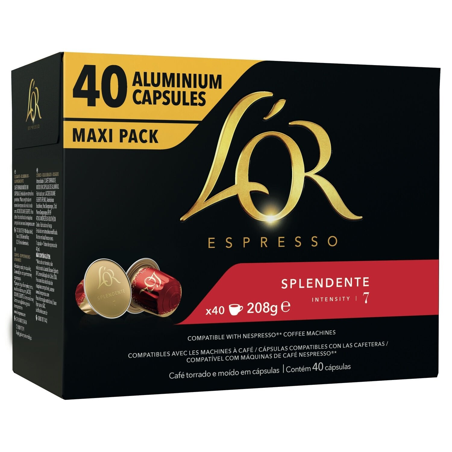 L'OR Espresso SPLENDENTE capsule coffee is an espresso of incomparable quality, with an elegant golden foam. Its irresistible taste is crowned with light notes of hazelnut finishing with a citrus zest. Large format: pack of 40 capsules. Color: red. Intensity level: 7. L'OR Espresso capsules are compatible with your coffee machine: L'OR BARISTA ® and Nespresso ®* Fragrant, rich and aromatic, coffee lovers appreciate the smoothness and fruity taste of L'OR coffee. Without doubt the best coffee in the world. Whether you like it strong, espresso or long, the aluminum capsule helps preserve its aromas. Our aluminum capsules are made in France. They are recyclable in selective sorting bins for municipalities recycling small aluminum packaging or by dropping them off at one of the many aluminum capsule collection points available. *Brand belonging to a third party with no connection to Jacobs Douwe Egberts