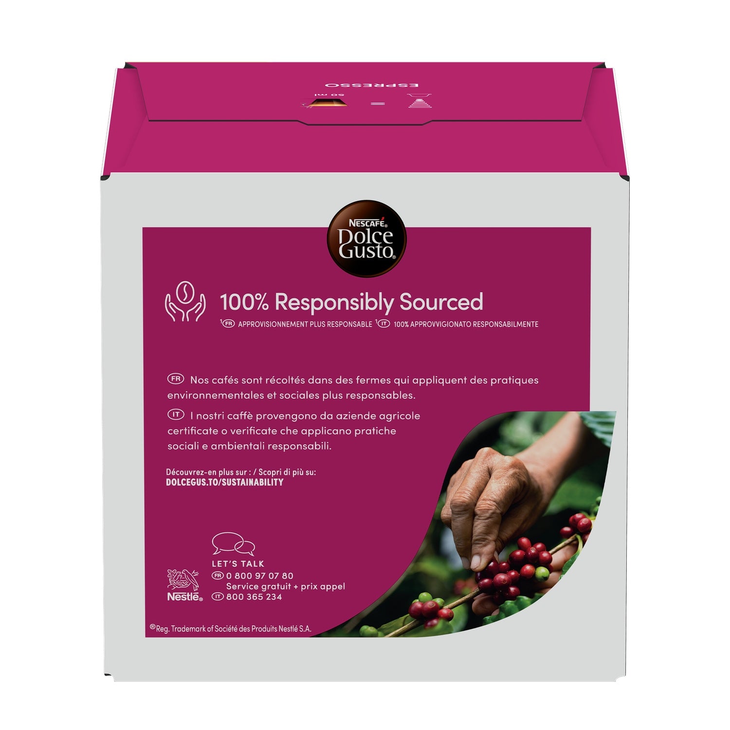 An elegant, lightly roasted 100% Arabica coffee in a 50ml cup. Intensity 5/11. A smooth, rounded coffee with subtle fruity aromas and hints of roasted nuts, a delicate body and a dense crema*. A 100% Arabica blend of two beans from South America, lightly roasted to reveal the subtlety of their aromas. The airtight capsule preserves the freshness and aromas of this coffee. The box contains 30 capsules designed for NESCAFE DOLCE GUSTO coffee machines and allows you to prepare 30 cups of Espresso. *Coffee foam.