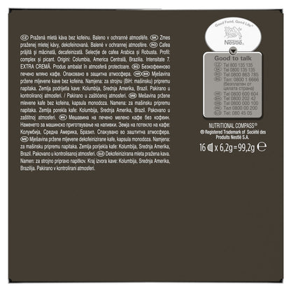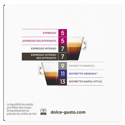 Our delicious Espresso Intenso, in a decaffeinated version!,The new recipe for our Decaffeinated Espresso Intenso offers you an even more generous crema*! *crema= coffee foam,The box contains 16 capsules designed for NESCAFE DOLCE GUSTO coffee machines and allows you to prepare 16 cups of Decaffeinated Espresso Intenso.,The airtight capsule preserves the freshness and aromas of this coffee.