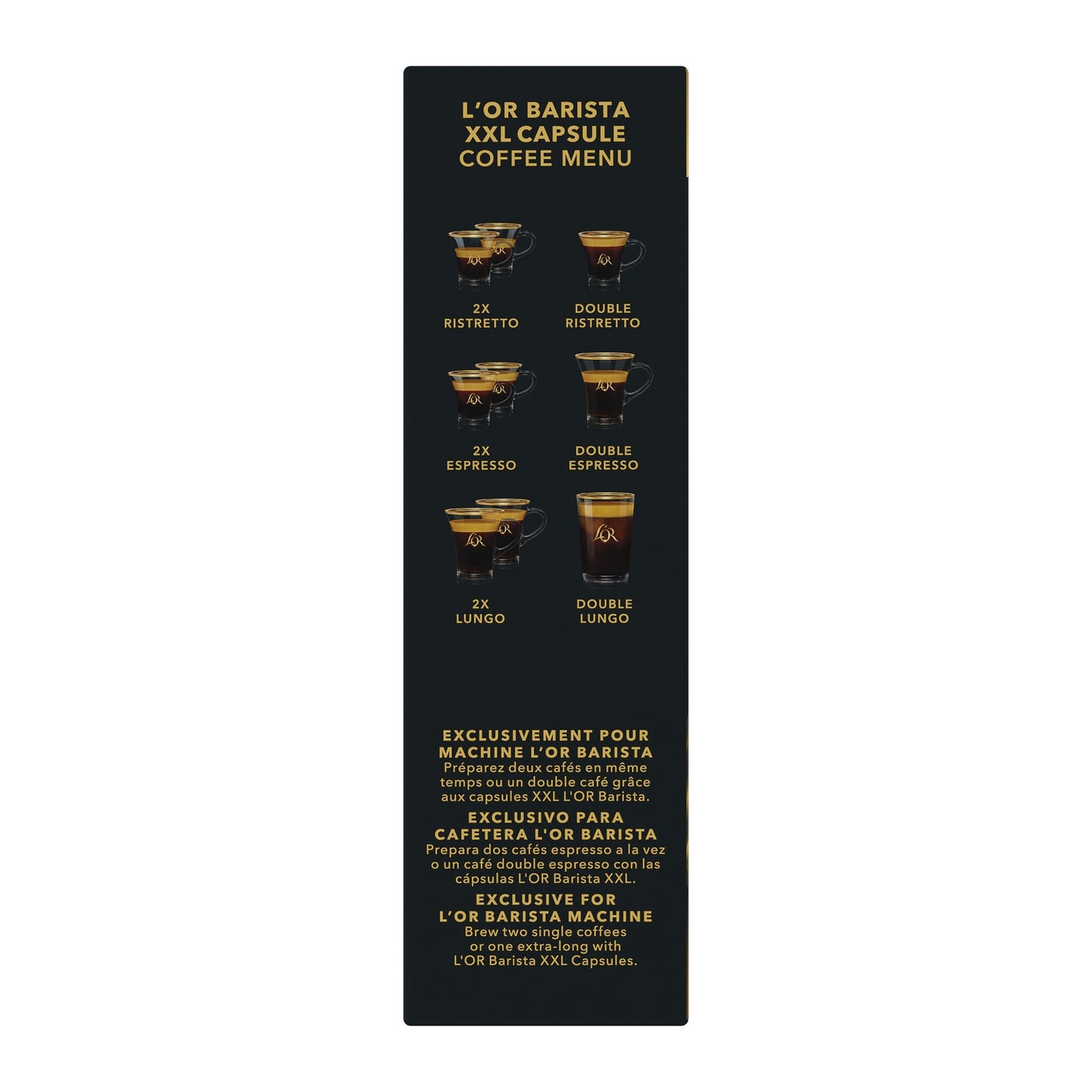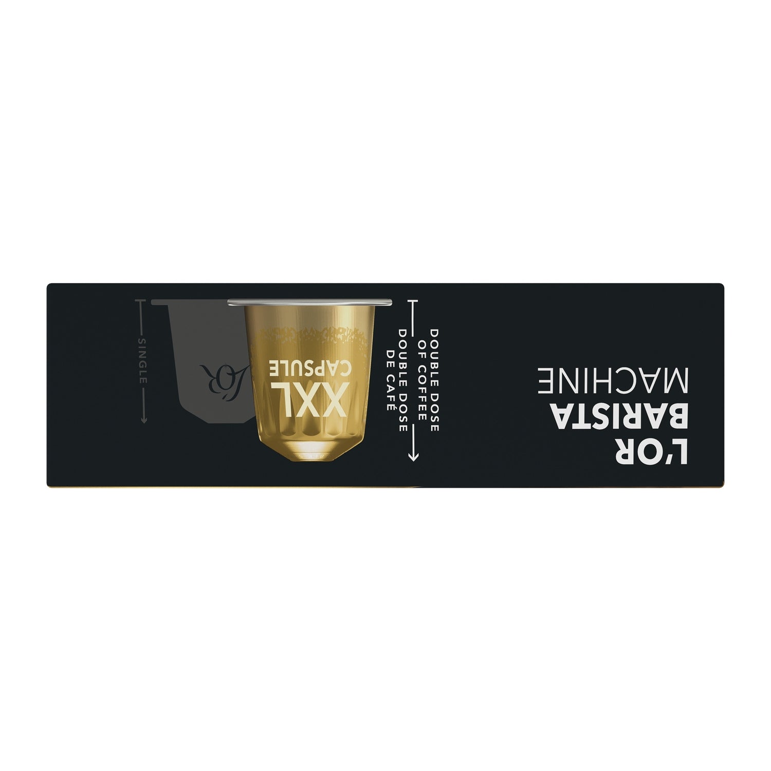 The XXL L'OR BARISTA® capsule contains a double dose of coffee, allowing you to prepare an extra-long coffee. Exclusively compatible with the L'OR BARISTA® coffee machine. Enjoy a coffee with an aromatic profile that is both elegant and fruity. Pack of 10 XXL aluminum espresso capsules. Recyclable capsules. L'OR BARISTA® XXL aluminum capsules have been designed to preserve all the aromatic intensity of the coffee beans carefully selected for each coffee. Intensity level: 5.