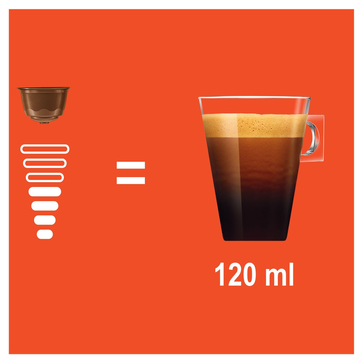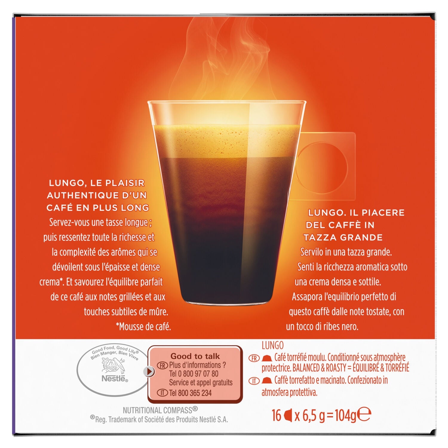 A roasted coffee made with premium Arabica beans, finely ground for rich aromas in a 120ml cup. Intensity 6/11.,An authentic coffee with roasted aromas and subtle hints of blackberry that are revealed under a fine crema*. *coffee foam.,A 100% Arabica blend of three beans from Ethiopia, Brazil and Colombia for a balanced and roasted coffee.,The airtight capsule preserves the freshness and aromas of this coffee.,The box contains 16 capsules designed for NESCAFE DOLCE GUSTO coffee machines and allows you to prepare 16 cups of Lungo.