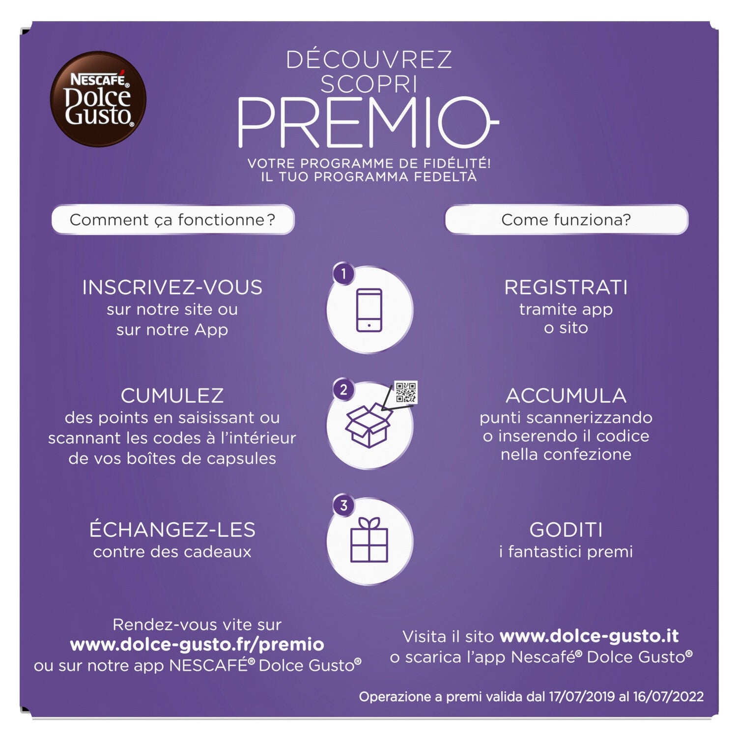 Discover the NESCAFE DOLCE GUSTO Lungo coffee capsule, a long and velvety coffee. All the aromatic richness of an espresso in a larger cup (120 ml), more SMOOTH and PACKED with a fine silky crema*. Enjoy this long and sweet coffee with complex aromatic notes of roasted coffee, with a subtle hint of blackcurrant. Intensity 6/11. *Coffee foam.