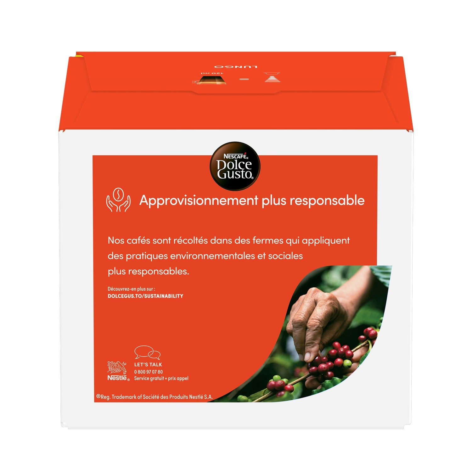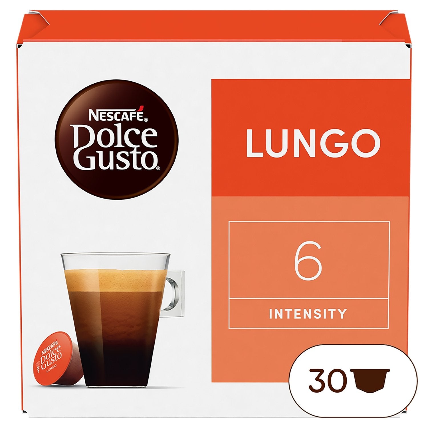A long and fruity Arabica coffee. Intensity 6/11.,Each capsule has been designed to be beautifully balanced, for a prolonged moment of enjoyment.,The airtight capsule preserves the freshness and aromas of this coffee.,Enjoy our NESCAFE DOLCE GUSTO magnum pack of 30 coffee capsules to stock up on your favorite drink.,*Coffee foam.