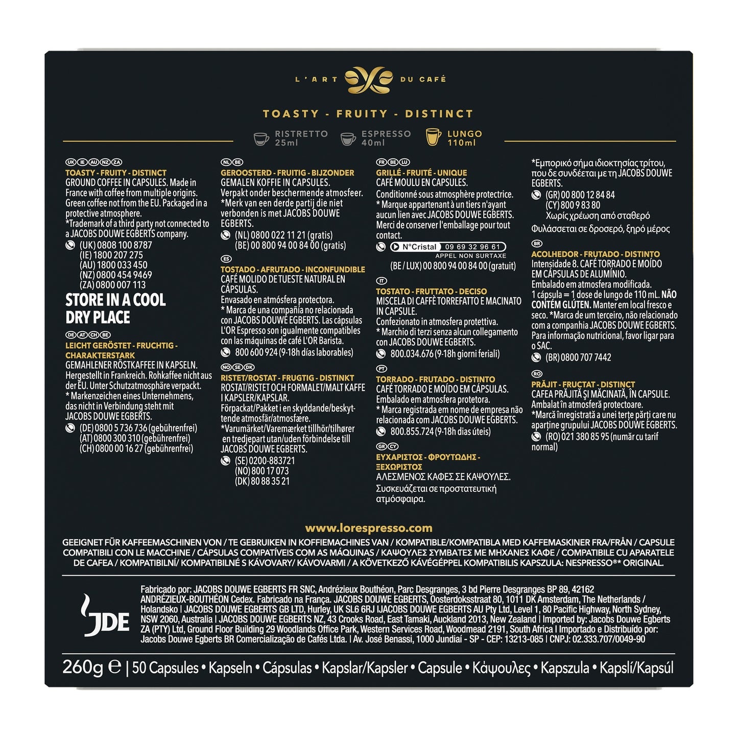 The pure pleasure of L'OR espresso in an aluminum capsule. ALUMINUM CAPSULE: L'OR aluminum espresso capsules have been designed to fit your Nespresso®* coffee machine and to better capture** the full aromatic intensity of L'OR's carefully selected coffee beans *Brand belonging to a third party with no connection to JACOBS DOUWE EGBERTS **compared to current plastic capsules compatible with Nespresso®* coffee machines