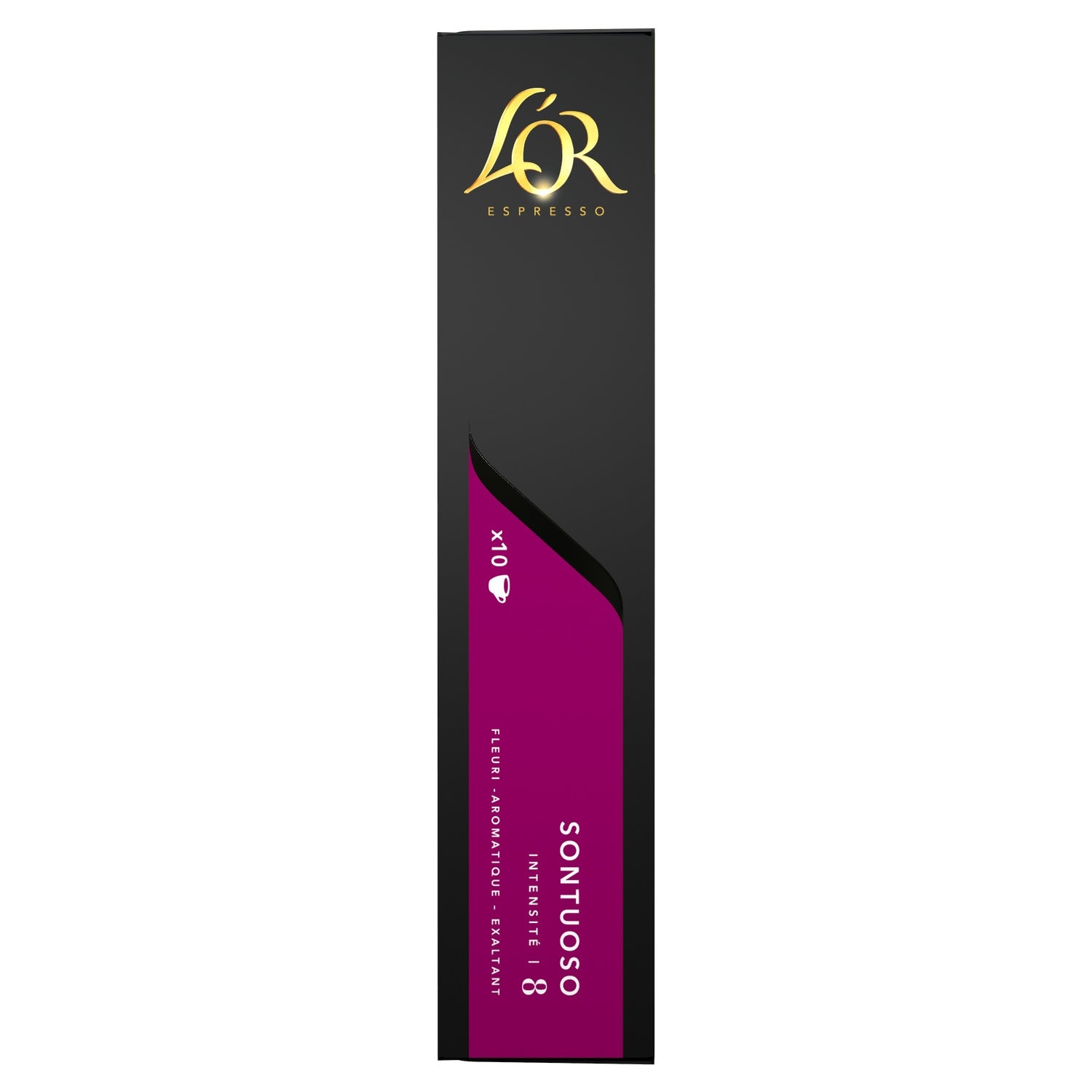 L'OR Espresso SONTUOSO capsule coffee is an espresso with an exhilarating taste, composed of notes of roasted almonds and floral notes, it is crowned by the amber glow of a rich and silky foam. Format: pack of 10 capsules. Color: purple. Intensity level: 8 L'OR Espresso capsules are compatible with your L'OR BARISTA ® and Nespresso ®* coffee machine. Fragrant, rich and aromatic, coffee lovers appreciate the smoothness and fruity taste of L'OR coffee. Whether you like it strong, espresso or long, the aluminum capsule helps preserve its aromas. Our aluminum capsules are made in France. They are recyclable in the selective sorting bins for municipalities recycling small aluminum packaging or by dropping them off at one of the many aluminum capsule collection points available. *Brand belonging to a third party with no connection to Jacobs Douwe Egberts