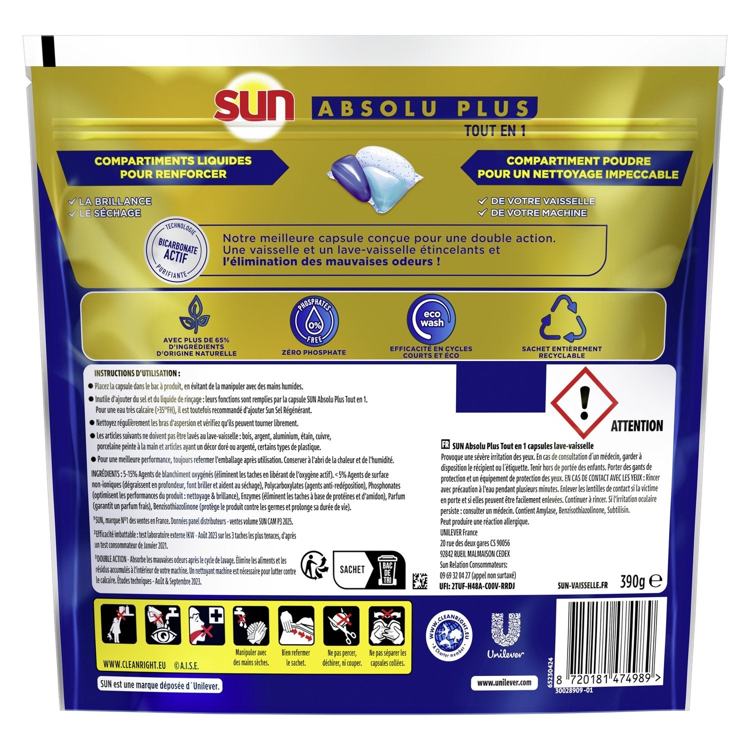 With Sun, discover the Absolu Plus experience, for even more performance: unbeatable effectiveness on the toughest stains¹. The new Sun Absolu Plus All-in-1 Bicarbonate 26 Washes dishwasher capsules combine the best of powder for impeccable cleaning of your dishes and your machine, with the best of gel for perfectly dry and shiny dishes! Thanks to the purifying Active Bicarbonate technology², this capsule offers a dual action. Not only does it guarantee the shine of your dishes and your machine, but it also absorbs unpleasant odors after the wash cycle, eliminating food and residue accumulated inside your machine. A complete solution in a single dishwasher product that performs the functions of detergent, rinse aid, and regenerating salt. This dishwasher capsule offers exceptional performance and a phosphate-free formula with more than 65% ingredients of natural origin. Our dishwasher capsules are effective in "eco" cycles and short cycles thanks to rapid dissolution. They therefore allow for reduced energy and water consumption. Directions for use: Place the capsule in the dishwasher detergent drawer, without adding salt or rinse aid, and avoid handling it with wet hands. For very hard water (>35° fH), however, it is recommended to add Sun Regenerating Salt. It's time to enjoy a double action with our Absolu Plus capsule! ¹Unbeatable effectiveness: IKW external laboratory test – August 2023, on the 3 most stubborn stains, based on a consumer test from January 2021. ²DOUBLE ACTION — Absorbs unpleasant odors after the wash cycle. Eliminates food and residue accumulated inside your machine. A machine cleaner is necessary to combat limescale. Technical studies – August and September 2023.