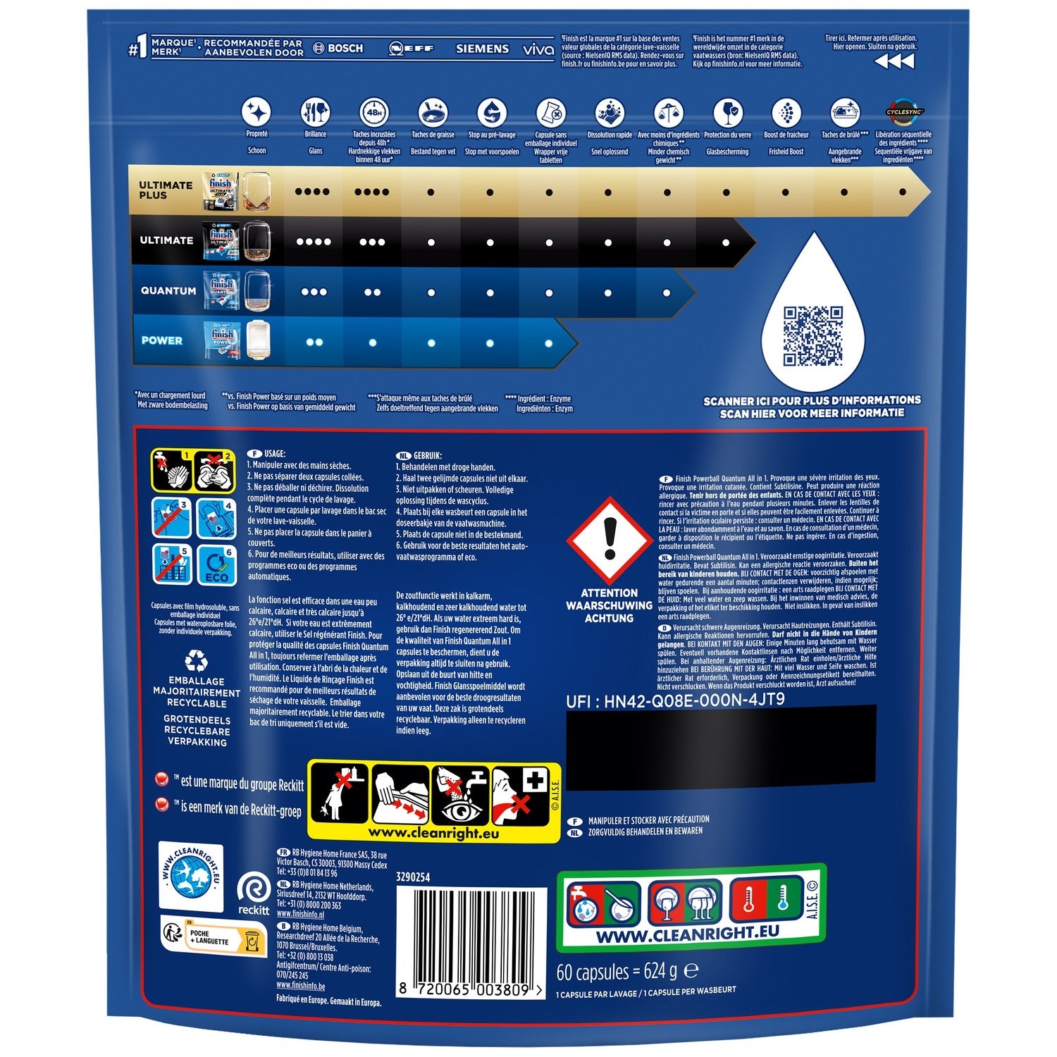 With Finish Quantum All in One, get a deep clean and brilliant shine the first time, every time! Its three-chamber capsule technology removes all types of food residue - without the need to pre-wash your dishes. The powder and gel work to remove scale and residue. The powerball protects glassware and helps keep your dishes sparkling. All this with 25% fewer chemicals (by weight) than our Finish Power tablets. Finish is the No. 1 brand based on overall value sales in the dishwasher category (source: NielsenIQ RMS data). Thanks to our expertise, major dishwasher brands trust and recommend us.