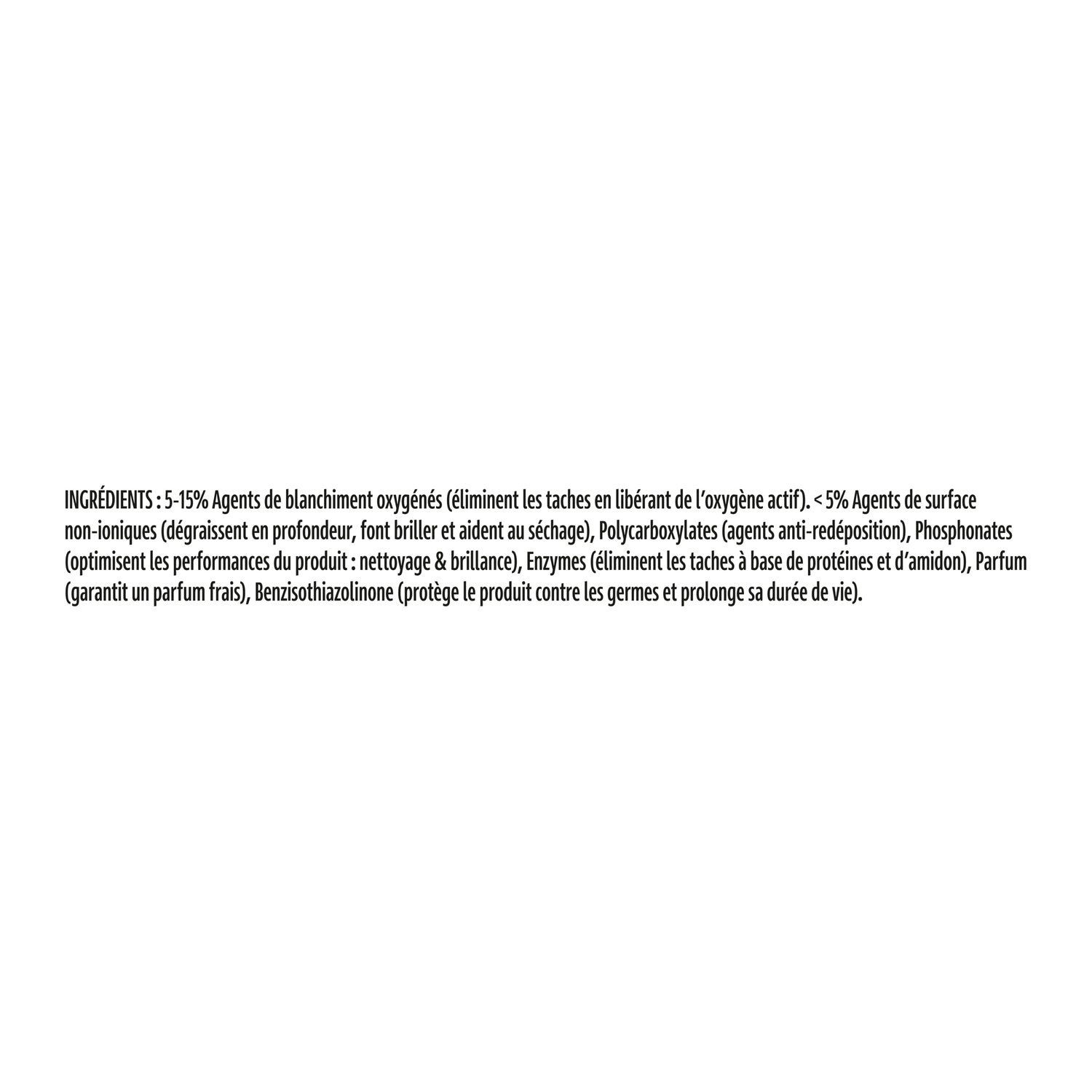 5-15% Oxygenated bleaching agents, Polycarboxylates. < 5% Non-ionic surfactants, Phosphonates, Enzymes, Perfume, Benzisothiazolinone.