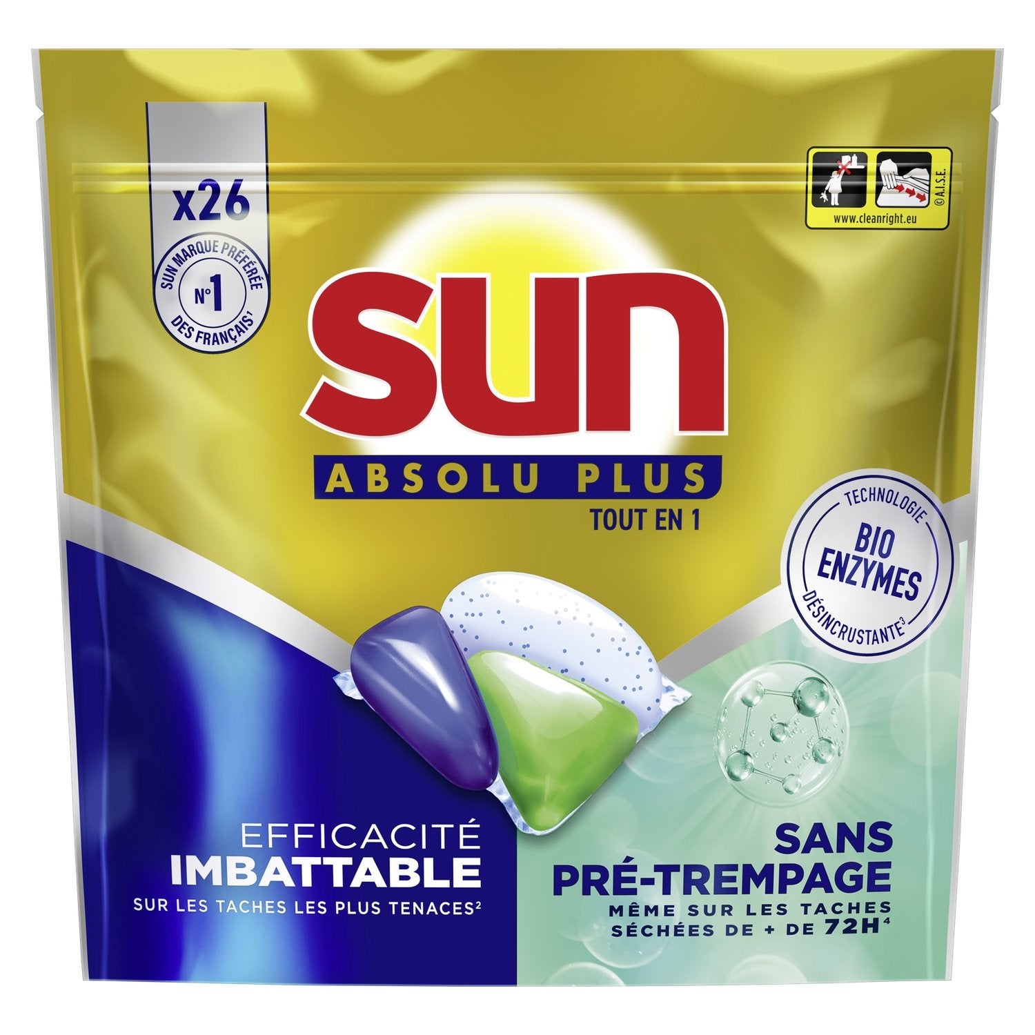 Sun Absolu Plus All-in-1 Bio-Enzymes 26 Washes dishwasher capsules ensure unbeatable effectiveness on the toughest stains¹.,These dishwasher capsules are equipped with descaling Bio-Enzymes technology²: a combination of enzymes that cut through food residue, thus eliminating stains on your dishes.,This dishwasher capsule removes burnt stains and also dried-on stains of more than 72 hours³, without pre-soaking.,It combines the best of powder for impeccable cleaning without pre-soaking and ultra-degreasing action, and the best of gel for perfectly dry and shiny dishes.,Each tablet is an all-in-1 dishwasher product providing the functions of detergent, rinse aid and regenerating salt.,Our capsules are phosphate-free and with more than 65% ingredients of natural origin. Their sachet dissolves quickly for impeccable efficiency on all types of cycles.