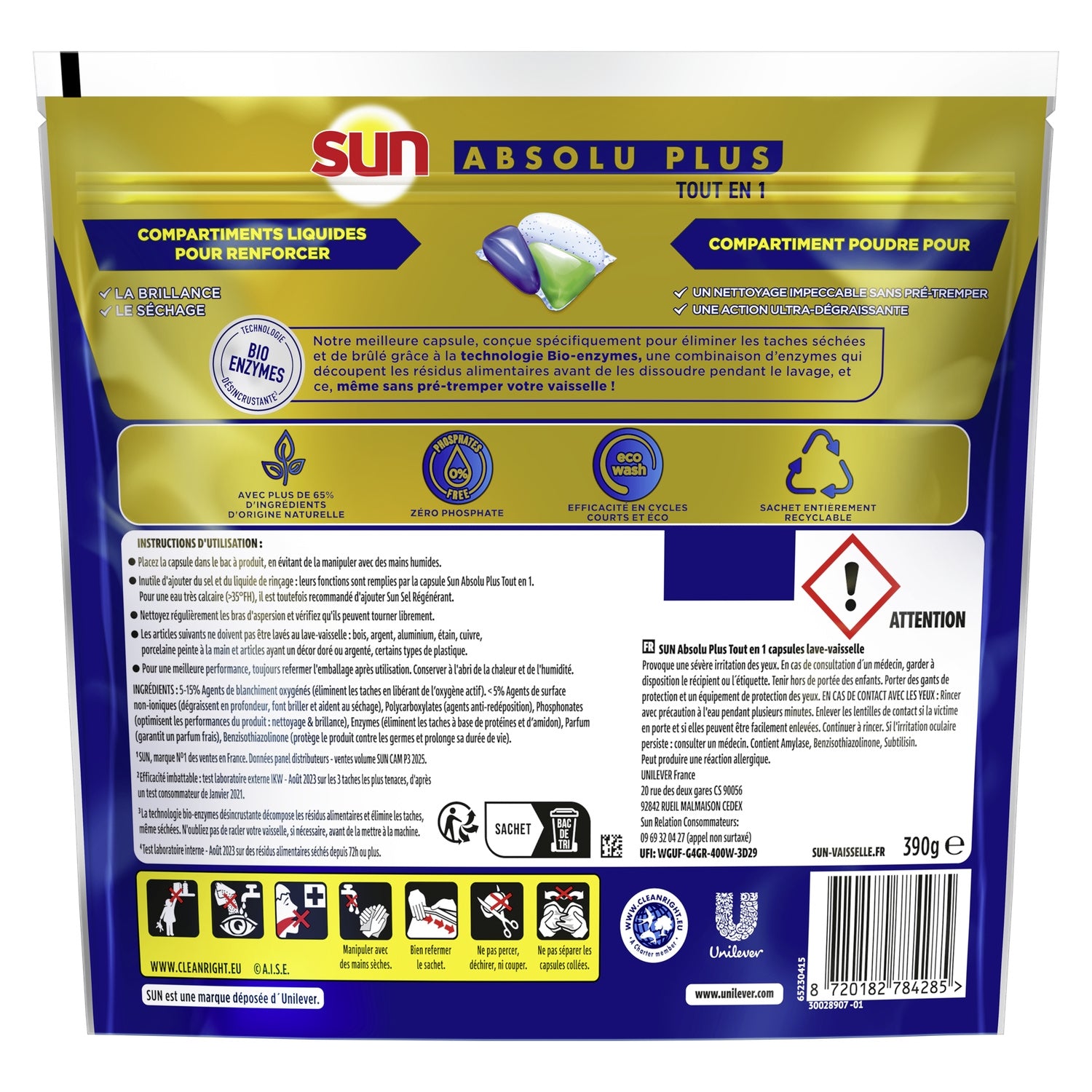 With Sun, discover the Absolu Plus experience, for even more performance: unbeatable effectiveness on the toughest stains¹. The new Sun Absolu Plus All-in-1 Bio-Enzymes 26 Washes dishwasher tablets combine the best of powder for impeccable cleaning, without pre-soaking, and ultra-degreasing action, with the best of gel for perfectly dry and shiny dishes. Thanks to Bio-Enzymes² descaling technology, a combination of enzymes that break down food residue before dissolving it during the wash, our Absolu Plus dishwasher capsule is specifically designed to remove burnt-on stains, and even dried-on stains of more than 72 hours³! A complete solution in a single dishwasher product that performs the functions of detergent, rinse aid and regenerating salt. This dishwasher capsule offers exceptional performance and a phosphate-free formula with more than 65% ingredients of natural origin. Our dishwasher capsules are effective in "eco" and short cycles thanks to rapid dissolution. They therefore allow for reduced energy and water consumption. STOP pre-soaking: our Absolu Plus dishwasher tablet takes care of it! Directions for use: Place the capsule in the dishwasher detergent drawer, without adding salt or rinse aid, and avoid handling it with wet hands. For very hard water (>35° fH), it is however recommended to add Sun Regenerating Salt. ¹Unbeatable effectiveness: external IKW laboratory test — August 2023, on the 3 most stubborn stains, based on a consumer test from January 2021. ²Bio-Enzymes descaling technology breaks down food residue and removes stains, even dried-on ones. If necessary, remember to scrape your dishes before putting them in the machine. ³Internal laboratory test — August 2023 on food residue dried for 72 hours or more.