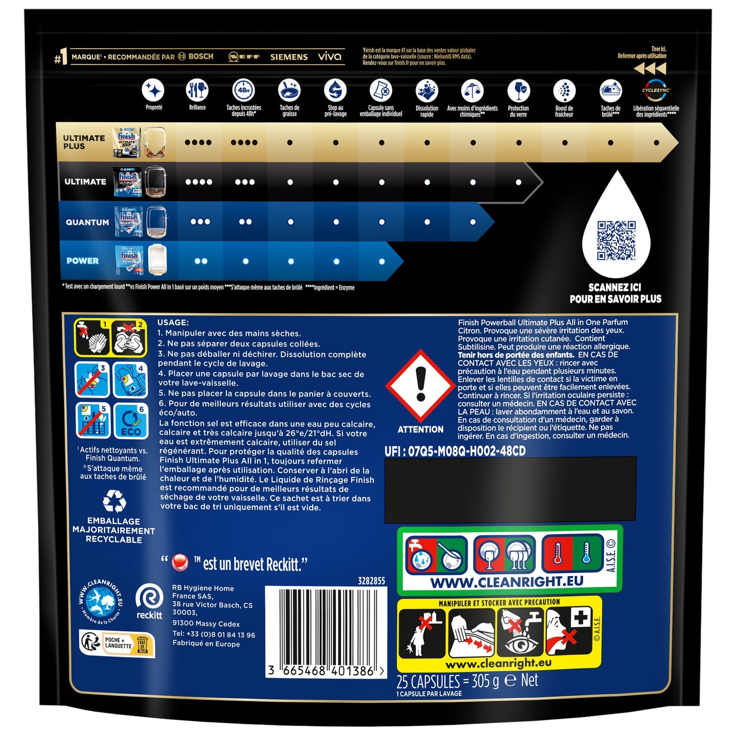 With Finish Ultimate Plus All in 1 Lemon, get a sparkling shine and intense cleanliness the first time, every time. Our new technology, CyclesyncTM, releases ingredients* sequentially for optimal cleaning. Thanks to its 4 actions throughout the wash cycle, this technology is effective even against burnt-on stains and without the need for pre-washing. Our capsules protect and care for your dishes while maintaining their shine wash after wash. *Ingredient: enzyme Our Ultimate performance with 15% (by weight) fewer chemical compounds than our classic Finish compact powder tablets (on average vs. Finish Power). Finish is the #1 brand recommended* by the biggest dishwasher brands. Thanks to our expertise, major dishwasher brands trust us and recommend us *Finish is the most recommended detergent based on market share of dishwasher manufacturers who recommend Finish