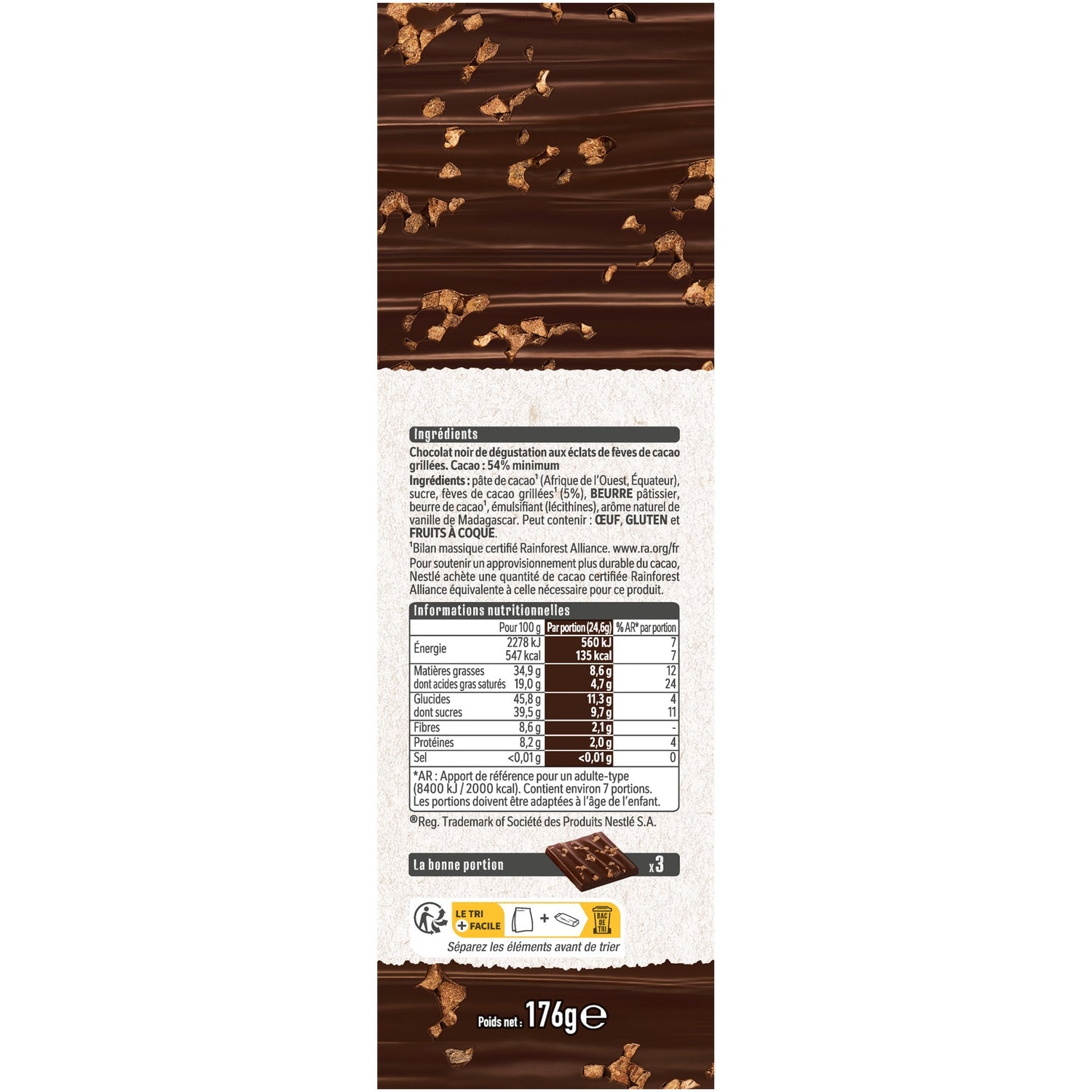 Ingredients: Cocoa mass* (West Africa, Ecuador), sugar, roasted cocoa beans* (5%), baking butter, cocoa butter*, emulsifier (lecithins), natural Madagascar vanilla flavoring. Cocoa: 70% minimum. * Rainforest Alliance certified mass balance www.ra.org/fr. May contain: EGG, GLUTEN and NUTS. To support more sustainable cocoa production, Nestlé purchases an equivalent quantity of Rainforest Alliance certified cocoa to that required for this product.