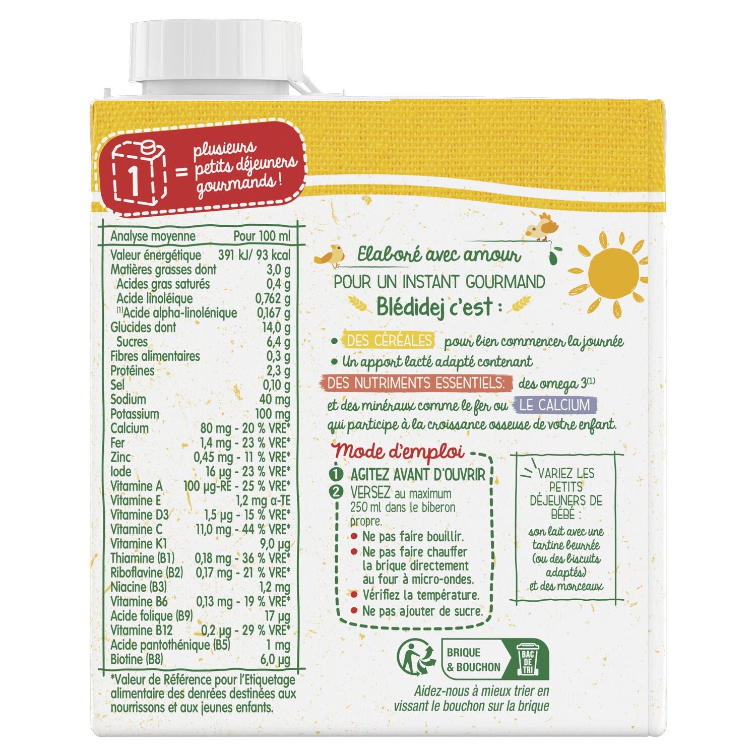 An adapted milk intake containing ESSENTIAL NUTRIENTS: omega 3* and minerals such as iron, or CALCIUM which contributes to your child's bone growth. *Alpha-linolenic acid, Blédidej, these are delicious milk cereals with a mild taste and a creamy texture to start the day off right. ,Recipes adapted to the needs* of babies from 12 months, to start the day off right! 1 carton = several gourmet breakfasts! *in accordance with infant nutrition regulations
