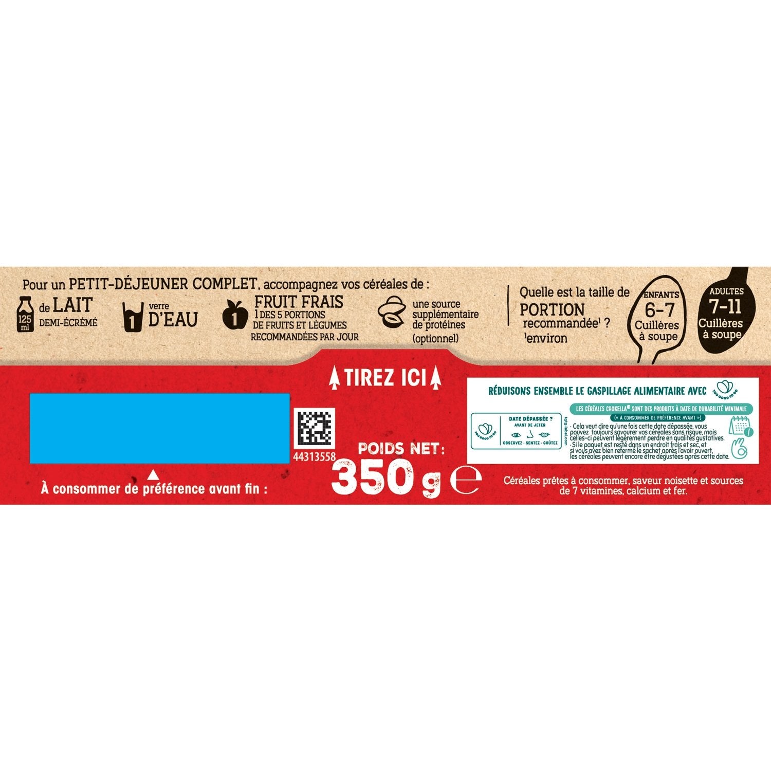Ingredients: Whole wheat 33.0%, corn semolina, sugar, dextrose, wheat starch, sunflower oil, glucose syrup, hazelnut paste 2%, skimmed milk powder 1.3%, fat-reduced cocoa powder* 1.3%, calcium carbonate, caramelized sugar syrup, salt, raising agent: sodium carbonates; natural flavoring, emulsifier: lecithins; antioxidant: tocopherol-rich extract; iron, vitamins B3, B5, D, B6, B1, B2 and B9. May contain OTHER NUTS. *Rainforest Alliance certified mass balance. www.ra.org/fr. Nestlé purchases an equivalent quantity of Rainforest Alliance certified cocoa to that required for this product.