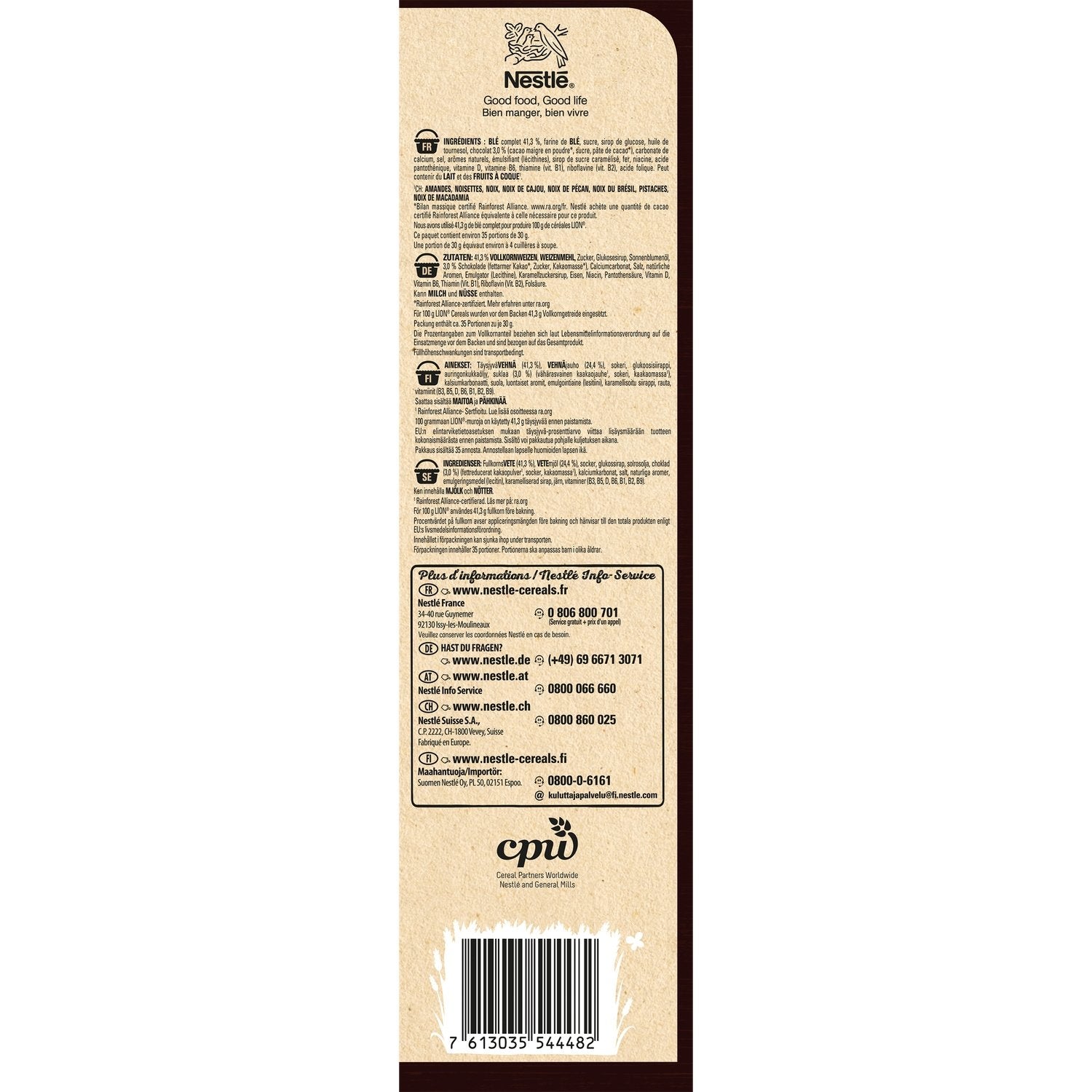 Ingredients: Whole wheat 41.3%, wheat flour, sugar, glucose syrup, sunflower oil, chocolate 3.0% (fat-reduced cocoa powder*, sugar, cocoa mass*), calcium carbonate, salt, natural flavorings, emulsifier (lecithins), caramelized sugar syrup, iron, niacin, pantothenic acid, vitamin D, vitamin B6, thiamine (Vit B1), riboflavin (Vit B2), folic acid. May contain peanuts and tree nuts. Rainforest alliance certified mass balance www.ra.org/fr.