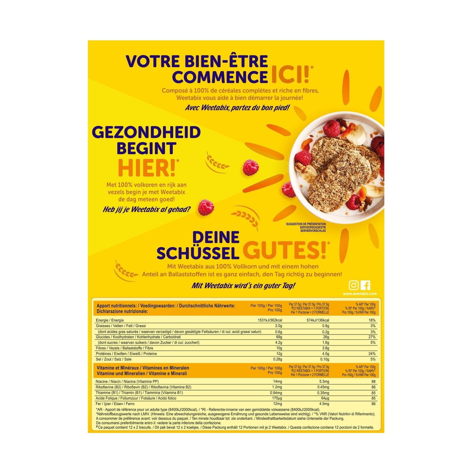 YOUR WELL-BEING STARTS HERE!* Made with 100% whole grains and high in fiber, Weetabix helps you start your day right! With Weetabix, you'll get off to a great start!