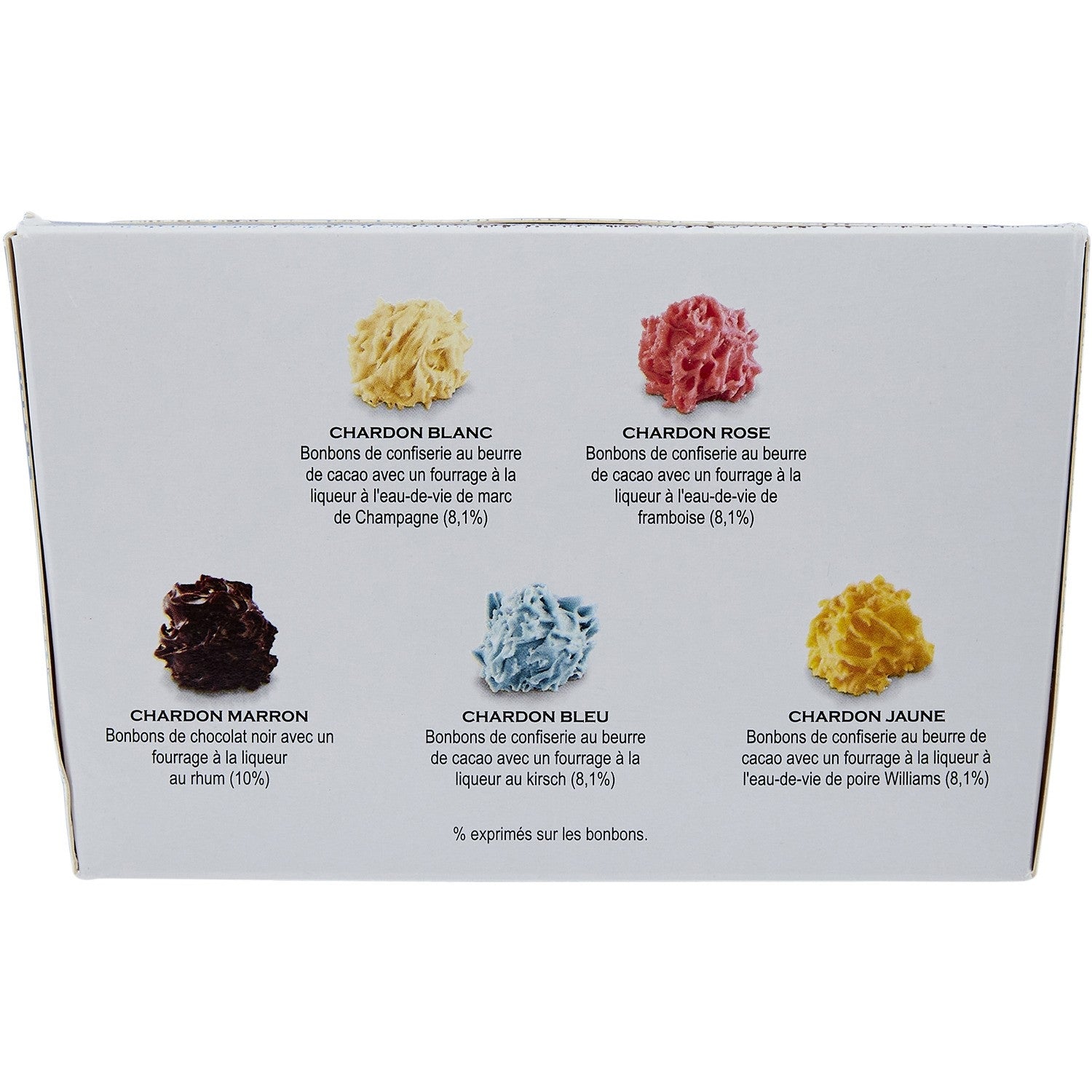 Sugar, cocoa butter, whole MILK powder, skimmed MILK powder, cocoa mass, rum 2%, kirsch 1.6%, raspberry brandy 1.6%, Williams pear brandy 1.6%, Marc de Champagne brandy 1.6%, emulsifier: sunflower lecithins, beetroot juice powder, anhydrous MILK fat, fat-reduced cocoa powder, ethyl alcohol, stabilizer: gum arabic, spirulina extract, safflower extract, natural vanilla flavoring. Contains 39.7% white chocolate and 10% dark chocolate.
