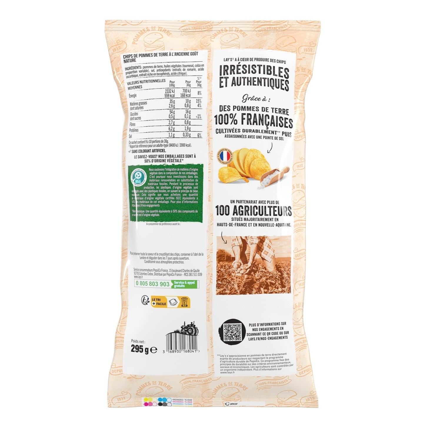 LAY'S OLD-FASHIONED RECIPE: When Lay's combines its unrivaled expertise since 1932 with French agricultural know-how, the result is old-fashioned crisps with a deliciously authentic taste and crispiness. TRADITIONAL EXPERTISE: It is thanks to its traditional know-how that Lay's helps offer you old-fashioned crisps that are as delicious as ever. Lay's Recette à l'Ancienne is made with thinly sliced potatoes that are gently cooked for extra crispiness. FRENCH CHIPS: Our Lay's Recette à l'Ancienne range is produced entirely from 100% French potatoes. We are proud to collaborate with our French farmers and to put their agricultural know-how at the service of our crisps expertise.